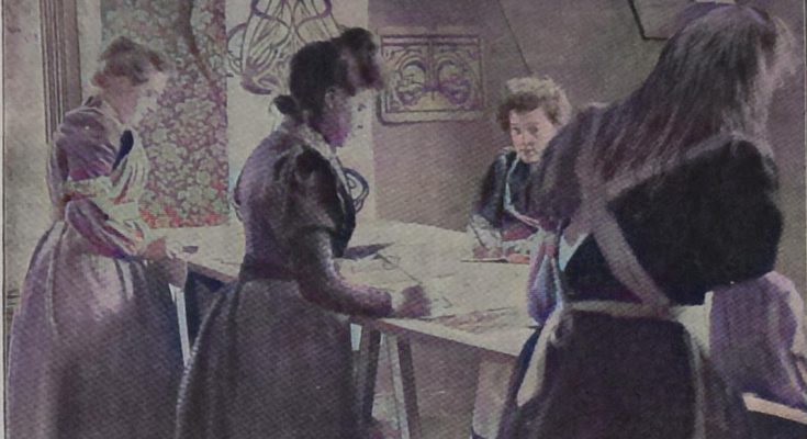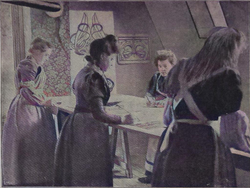 Das Auffallende dieser Darstellungen besteht darin, daß sie nicht fabrikmäßig in Massen hergestellt, sondern alle mit der Hand ausgeführt werden. Wenn die Zeichnungen der Maler vorliegen, so wählt die begabte Leiterin der Werkstätte, Frau A. Wegerif – Gravestein (Portr.), mit feinem Takt die verschiedenen Farben aus, die für die Ausführung verwendet werden sollen.