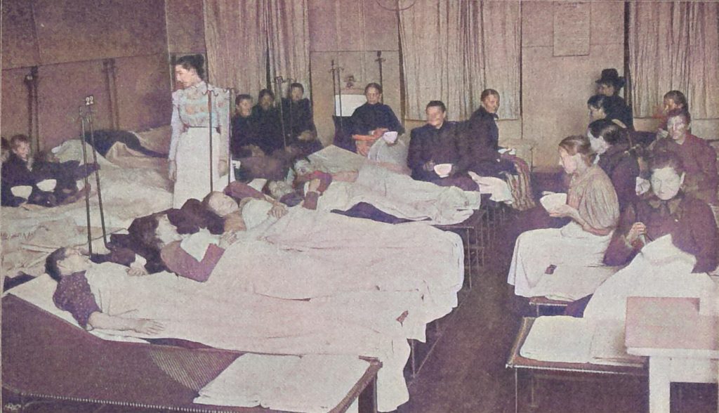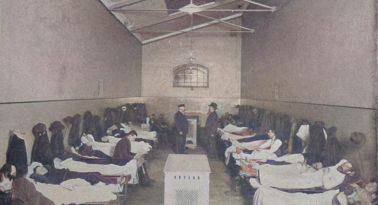 Die Aermsten haben nirgends in der Millionenstadt ein anderes Unterkommen und sind glücklich, daß sie dieses Asyl gefunden, begründet und erhalten durch wärmste Menschenliebe und ein stets reges Mitgefühl für die vom Schicksal Verfolgten und Bedrängten. Eine 500 Quadratmeter große Sammelhalle, die durch elektrisches Licht erleuchtet und mittels Dampfheizung gut erwärmt ist, während Ventilatoren für stete Zuführung reiner Luft sorgen, nimmt die Asylisten auf und bietet Platz für 700 Personen – genau die Zahl, denen das Asyl Obdach gewähren kann. Niemand wird nach seinem Namen, seiner Herkunft gefragt, niemand braucht Rechenschaft abzulegen, warum er die Hilfe des Asyls in Anspruch nimmt; er ist obdachlos, ist unglücklich, also ist er hier willkommen, ihm wird das ersehnte Heim gewährt!