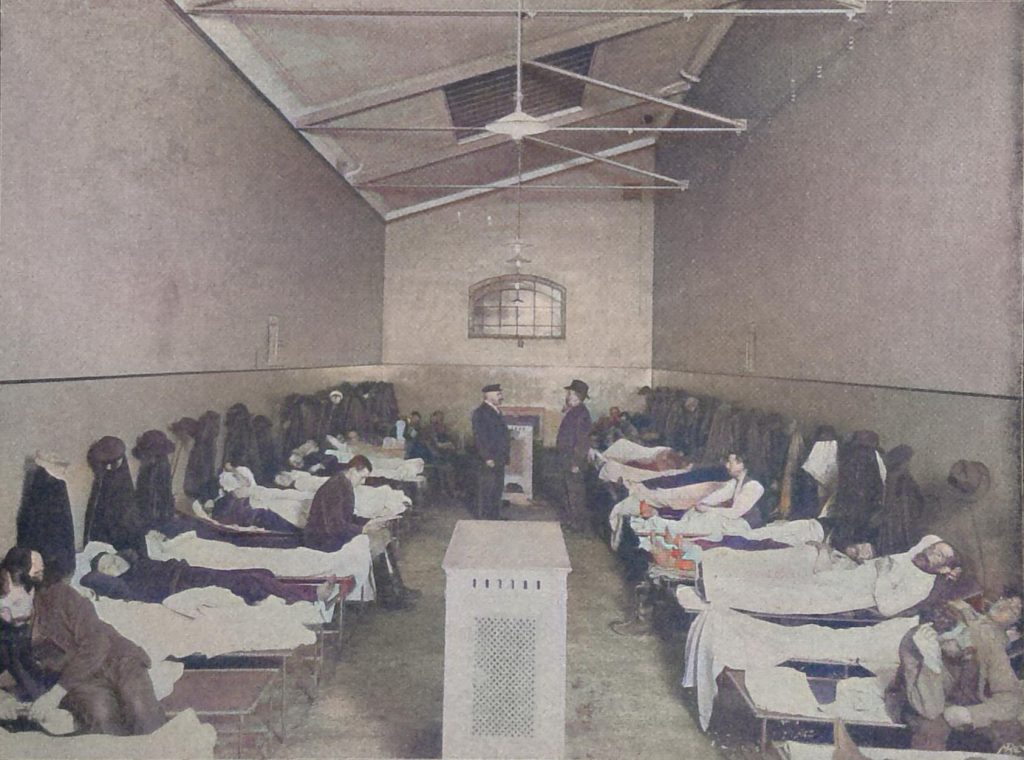 Aus dem Wasch- und Badesaal gelangen die Asylisten am Aufnahmeschalter vorüber – ein Beamter weist hier die gewohnheitsmäßigen Bettler und Herumtreiber, die am liebsten jeden Abend das Asyl aufsuchen möchten und dadurch wirklich Bedrängten und Notleidenden die Plätze fortnehmen würden, zurück – in die weite Speisehalle, die 500 Personen Sitzgelegenheit bietet. Von der benachbarten Küche aus, deren Kochkessel für 400 Liter Suppe, 200 Liter Kaffee und 50 Liter Milch eingerichtet sind, werden die Speisen (kräftige Suppe, Brot u. s. w) verabreicht, ferner können die Asylisten hier ihre Kleidung in Ordnung bringen, wozu sie unentgeltlich das Material erhalten. Dann geht’s in die Schlafsäle, 14 an der Zahl, jeder mit 50 Betten, mit Heiz- und Lüftungsvorrichtungen wie elektrischer Beleuchtung versehen. Auch hier fällt die große Sauberkeit angenehm auf; die Fußböden sind aus Terrazzo, die Wände mit geglättetem Zementputz versehen, so daß eine gründliche tägliche Reinigung mittels Wasserspülung erfolgen kann, die Bettstellen bestehen aus Eisen, und die Decken werden häufig desinfiziert.