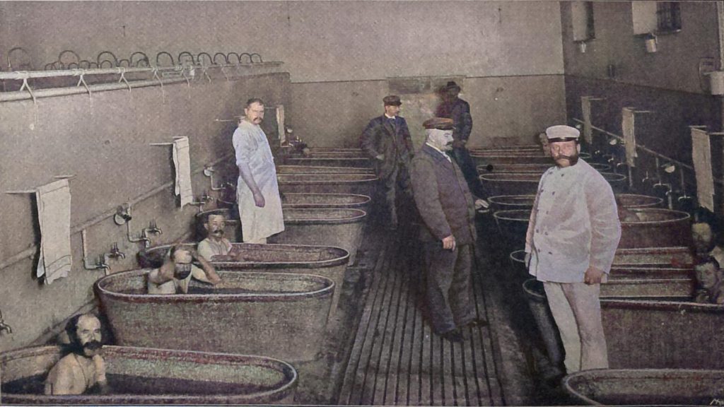 Und nicht nur das Heim allein. Denn neben der Sammelhalle liegen zwei Säle, der eine zum Waschen, der andere zum Baden eingerichtet, und in kleineren Trupps betreten die Asylisten diese Räume. In dem Waschsaal sind 60 Waschbecken vorhanden für Kalt. und Warmwasser, in dem geräumigen Badesaal 20 Wannen und 56 Brausebäder. Alles ist ungemein praktisch und sauber, und die Angestellten sorgen dafür, daß sich das Waschen und Baden schnell und in Ordnung vollzieht. Die Personen, die baden wollen; entledigen sich im Auskleideraum ihrer Kleidung, die während des Badens desinfiziert wird, und erhalten sie dann in einem besonderen Gemach zurück Welch seltene Wohlthat, dieses Bad für die Aermsten, die tagsüber in den Straßen umhergeirrt sind, vergeblich nach Arbeit forschend, und die mit dem körperlichen Behagen neue Hoffnung gewinnen, daß sie doch noch nicht völlig ausgestoßen sind von der menschlichen Gesellschaft, daß es ihnen vielleicht doch noch gelingen wird, nach vielen Entmutigungen und Entbehrungen, nach trüben, sorgenschweren Wochen und Monden ein Plätzchen an der Sonne zu gewinnen!