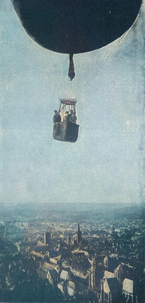 Herrlich sind die Naturgenüsse während der Fahrt; es ist unmöglich, mit Worten wiederzugeben, welch erhabene Gefühle den Menschen hoch oben über der Erde freischwebend in weltentrückter Stille beseelen. Nur dumpf tönt das Stimmengewirr größerer Ortschaften an das Ohr des Luftschiffers; an dem Zusammenlaufen vieler schwarzer Punkte auf der Erde, alias Menschen, sieht er, daß der plötzlich am Himmel erscheinende Ballon den Gegenstand der Bewunderung bildet.
