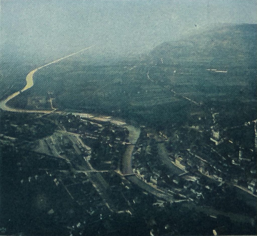 Wir erkennen aus einer Höhe von 1200 Metern noch das Zifferblatt der Uhr an der Thuner Kirche, mit einem Fernglas sehen wir, daß es gerade!e 12 Uhr ist. Wie Silberfäden nehmen sich die Arme der Aare aus, die die Stadt durchfließt. Auf den beiden Brücken und auf dem freien Platz im Vordergrund sehen wir Menschen und Fahrzeuge dahineilen.