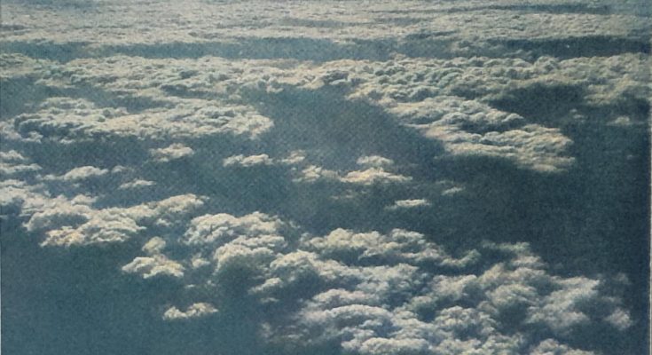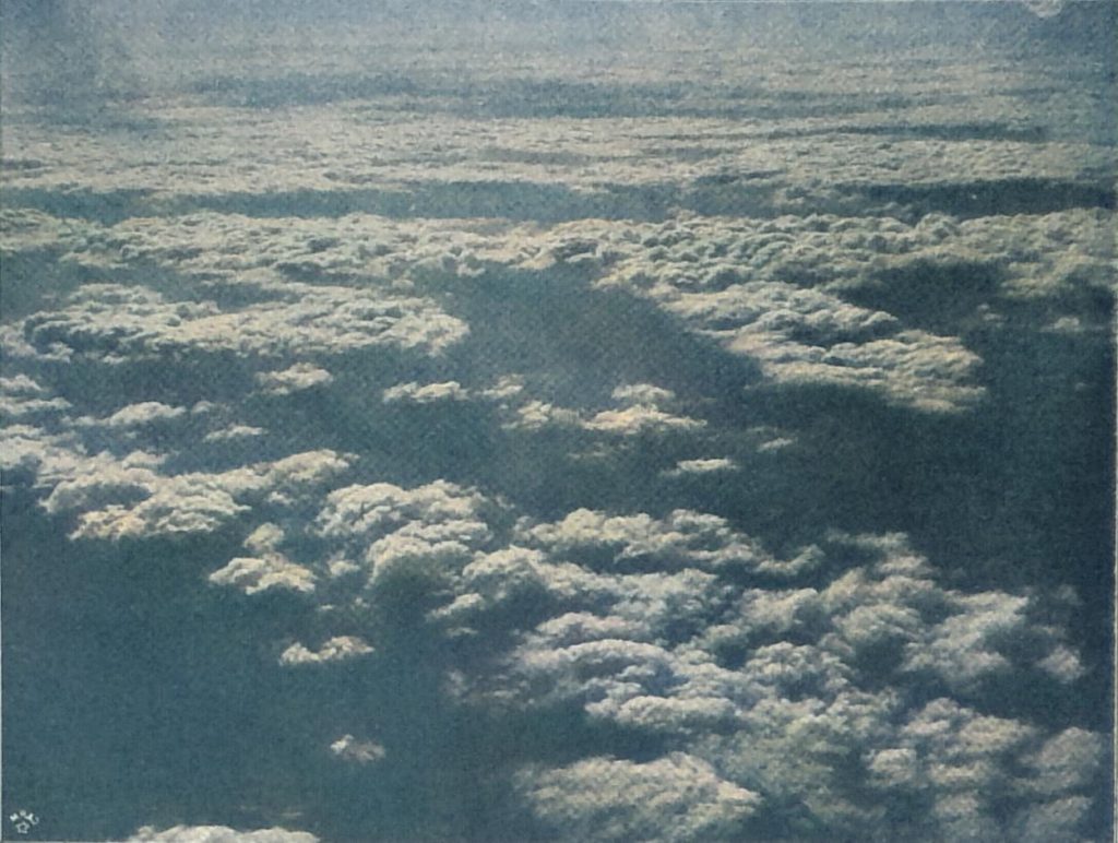 Deutlich markieren sich im Hintergrund rechts die einzelnen Felder durch ihre Furchen und wechselnden Saaten. Deutlich schimmert in der Ferne in bläulichem Dunst das Gebirge; schweben wir erst über ihm, so verliert es an Massigkeit, die Höhen scheinen aus der Vogelperspektive flach und niedrig zu sein. Wir sehen es den Teufelsbergen (Diablerets) in den Freiburger Alpen, die gerade aus unserer Höhe von 4500 Metern durch ein Wolkenloch sichtbar werden, nicht an, daß sie über 3200 Meter hoch sind. Ein eigener Anblick ist es, wie die Wolken in zerrissenen Gebilden unter uns dahineilen.