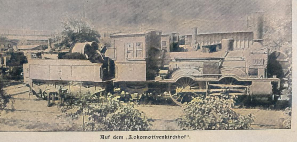 Das obere Bild führt uns auf den Platz, der die ausrangierten Maschinen aufnimmt, und der durch den Baumsschlag, von dem er umgeben ist, den Eindruck eines „Lokomotivenkirchhofs“ macht. Die alten Maschinen mit ihren zerschlagenen Fenstern, bedeckt von Rost, erregen fast das Mitleid des Beschauers. Vor 30 Jahren kosteten diese Maschinen das Stück 21000 Taler, und man hielt sie für Wunderwerke der Technik. Heute bekommt man die größte und beste vierachsige Schnellzugslokomotive von fast doppeltem Gewicht schon für 72 000 Mark. Die Lokomotiven aber, die hier auf den Kirchhof gebracht sind, finden noch keine Ruhe. Es kommen Händler, Spezialisten, die mit alten Lokomotiven handeln, um diese Veteranen des Verkehrs für 3000 bis 3500 Mark das Stück aufzukaufen. Von den Händlern werden die Lokomotiven „abgewrackt“; einzelne Teile, wie zum Beispiel die Kessel, finden noch bei stationären kleinen Maschinen Verwendung, wertvolleres Material, wie Kupfer und Stahl, wird losgerissen und verkauft, die Eisenteile werden zerschlagen und zum Einschmelzen an die Eisenhütten und Werkstätten verkauft.
