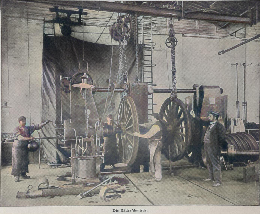 Das rollende Material der Eisenbahn, Lokomotiven und Wagen, wird von der Privatindustrie aus besonderen Fabriken geliefert. Durch den Betrieb wird viel Material verschlissen, und sowohl Lokomotiven wie Wagen werden reparaturbedürftig. Solange Eisenbahngesellschaften bestehen, haben sie für die Reparatur des rollenden Materials eigene Werkstätten besessen, und auch die preußische Staatsbahn verfügt über Anstalten dieser Art, die zum Teil einen riesenhaften Umfang haben.