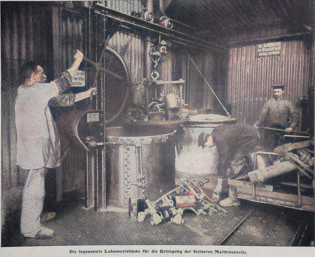 Die kleineren äußeren Teile der Lokomotive werden durch den Gebrauch außerordentlich schmutzig. Lokomotivführer und Heizer halten die Lokomotive, die sie ständig benützen, nicht nur aus dienstlichem Zwang, sondern auch aus einem gewissen „Sportgefühl“ heraus so sauber wie nur möglich. Die kleineren Teile des Untergestells sind aber nicht überall zugänglich und können daher nur gereinigt werden, wenn sie nach der Werkstatt kommen. Verharztes Schmieröl und Staub haben diese Federn, Schrauben, Platten, Buchsen, Ventile und Rohre mit einer Schmutzkruste überzogen, die allen Anstrengungen gewöhnlicher mechanischer Reinigung spottet. Es ist daher in der Werkstatt eine besondere Küche eingerichtet worden, die wohl auch für die Hausfrauen Interesse hat und in die untenst. Abb. hineinführt. Es stehen hier vier gewaltige Kessel, von denen nur zwei auf dem Bild sichtbar sind. In diesen werden die kleineren Teile der Lokomotiven und Wagen von dem ihnen anhaftenden Schmutz durch Kochen in Sodalauge gereinigt. Das „Lokomotiven oder Wagenklein“ kommt, nachdem es einige Stunden mit Dampf in der Sodalauge gekocht worden ist, schon in ganz ansehnlichem Zustand aus dem Kessel heraus, wird dann aber noch einer sorgfältigen mechanischen Reinigung und genauen Untersuchung unterzogen.