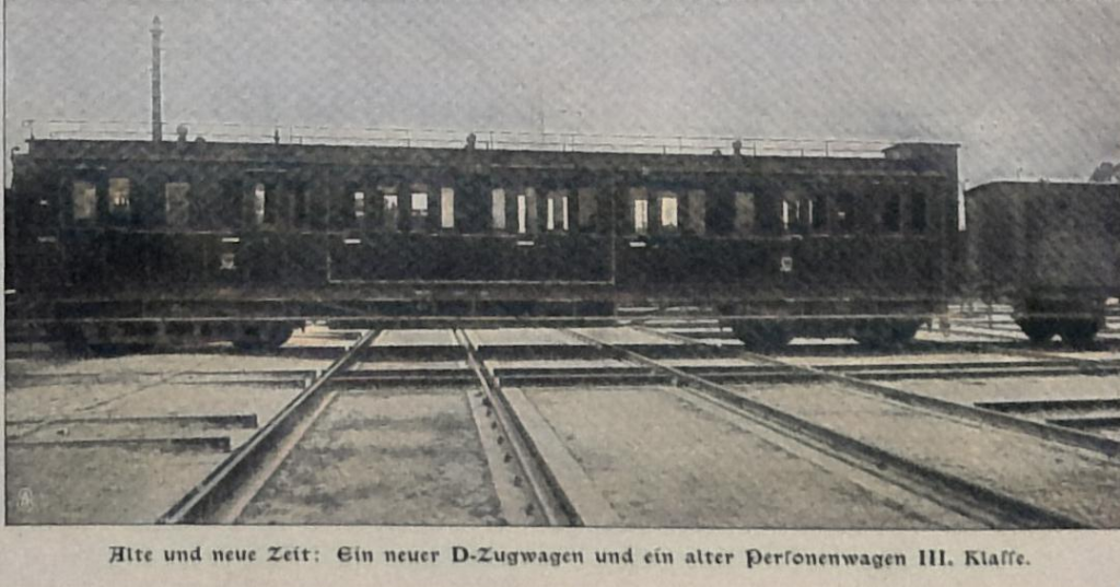 „Alte und neue Zeit“ könnte man dieses Bild nennen, an dem durch liebenswürdiges Entgegenkommen der Verwaltung der Reparaturwerkstatt, und um das Bild zu ermöglichen, ein neuer vierachsiger D. Zugwagen und ein alte zweiachsiger Personenwagen III. Klasse mittels der Schiebebühnen nebeneinander auf ein Gleis gebracht wurden.
