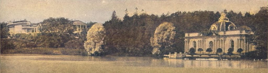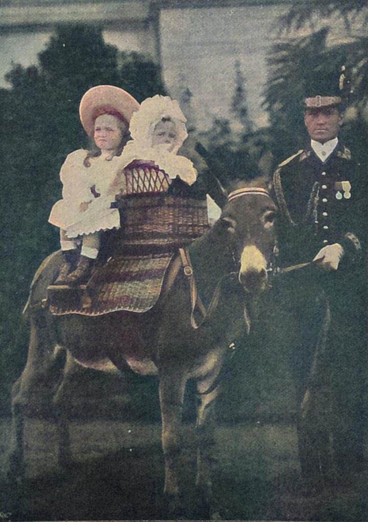 Der letzte Sommer brachte den kleinen Prinzessinnen eines Morgens eine ungeahnte Ueberraschung. Da sie durchaus einmal hoch zu Roß erscheinen wollten, stand plötzlich vor ihrem Fenster ein wohlgesatteltes Langohr. Da gab’s kein Halten mehr und, langsam von Dienern geführt, ging der Ritt durch den grünen Park von Zarskoje Sjelo. Dieses märchenhaft schone Schloß, in dem die Zarentöchter in sicherer Hut ihre Jugend verleben, ist von der Kaiserin Katharina I erbaut und von Katharina II mit den herrlichsten Kunstwerken geschmückt. Eine direkte Eisenbahn, die älteste im ganzen russischen Reich, verbindet es mit Petersburg, so daß der Zar sofort von den Regierungsgeschäften in die Arme seiner Kinder eilen kann.