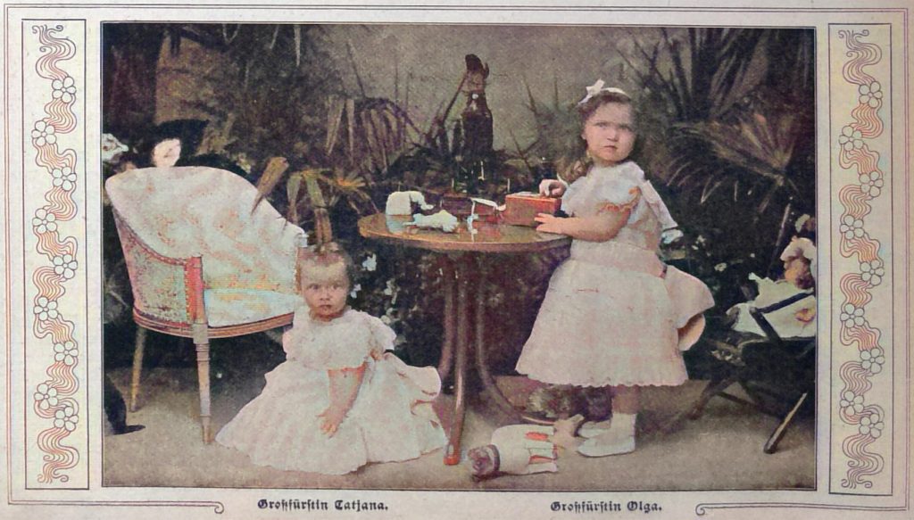 Durch zahlreiche und kostbare Spielsachen werden die Zarentöchter nicht verwöhnt im Gegenteil, die geistreiche Mutter erweckt schon zeitig bei ihren Lieblingen das Gefühl für Einfachheit. Großmama Viktorias schöne Puppen kommen nur an besonderen Festtagen in Gebrauch, sonst müssen Blumen und Ballspiele die Zeit ausfüllen.