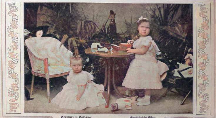 Die Bewohner von Zarkoje Sjelo, die am häufigsten Gelegenheit haben, die kaiserlichen Kinder zu sehen, da sie täglich im dortigen Park ihre Spazierfahrten machen, können sich nicht genug erfreuen an den gesunden lieblichen Prinzessinnen, die den Vorübergehenden oft herzliche Kußhändchen zuwerfen.