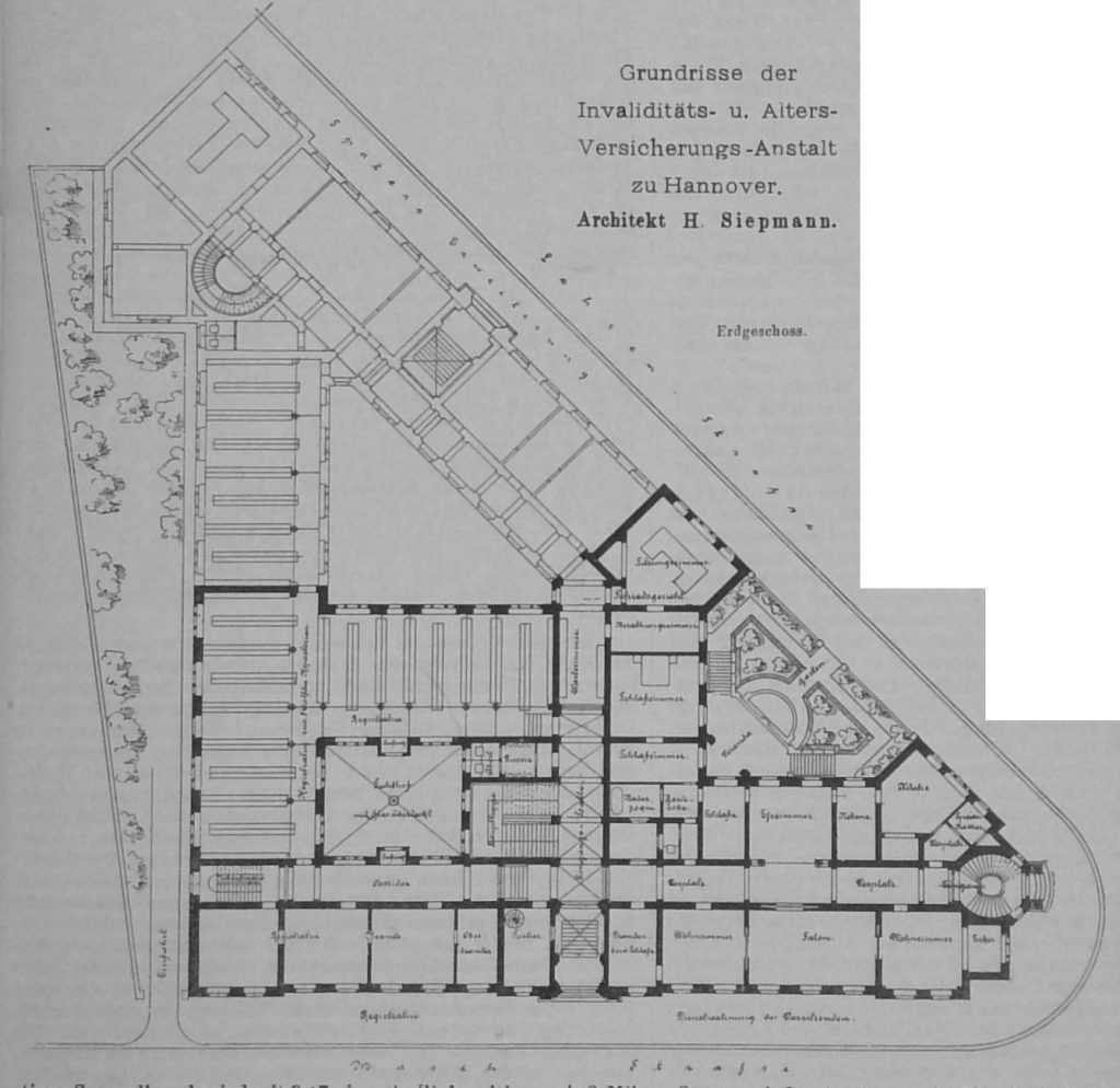 Im Oktober d. J. hat unter fünf Hannover’schen Architekten ein engerer Wettbewerb statt gefunden, welcher die Bearbeitung von Entwürfen zu einem in dieser Stadt zu errichtenden Geschäftshause für die Alters- und Invaliditäts-Versicherungs-Anstalt zur Aufgabe hatte. Zusammen mit dem Architekten Hrn. Wilh. Hauers aus Hamburg war der Unterzeichnete als Preisrichter berufen worden; es erhielt unter den von den fünf Architekten W. Kayser, C. Grelle, G. Heine, H. Lorenz und H. Siepmann eingereichten Arbeiten diejenige des letztgenannten den Preis.