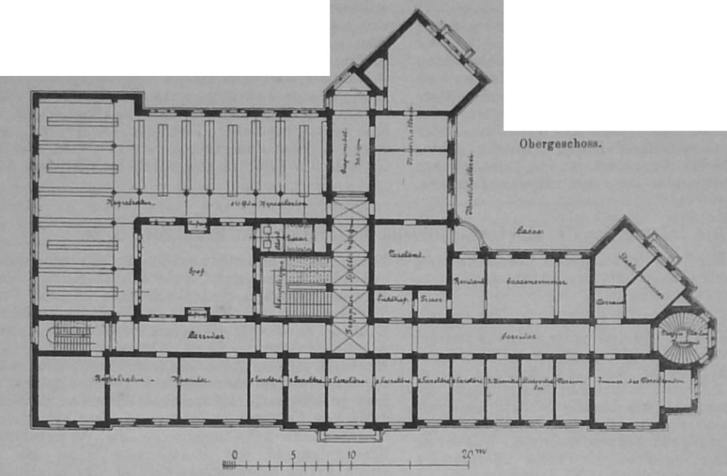 Den im Vorstehenden entwickelten Bedürfnissen und Anforderungen der Anstalt entsprach der Siepmann’sche Entwurf, von welchem wir 2 Grundrisse und 1 Ansicht geben, soweit, dass demselben der ausgesetzte Preis von 1000 M. (ausser 500 M. Entschädigung, welche jedem Bewerber zugebilligt war) ertheilt und unter unwesentlichen Abänderungen zur Ausführung angenommen werden konnte. Besonders hervorgehoben wurde in der Beurtheilung des Preisgerichtes die zweckmässige Ausnutzung des Bauplatzes, die klare und übersichtliche Vertheilung der Geschäfts-, Arbeits- und Wohnräume, sowie die Anordnung der Treppen und Verbindungsgänge. Als hervorragend gut gelöst ist die Anlage der Registratur und ihrer Nebenräume zu betrachten. Die meisten der übrigen Entwürfe, unter denen übrigens die Arbeiten von Heine und Lorenz als die nächstbesten hervorzuheben sind, zeigten grade inbezug auf diesen wichtigsten Theil des Gebäudes mehrfache Mängel.