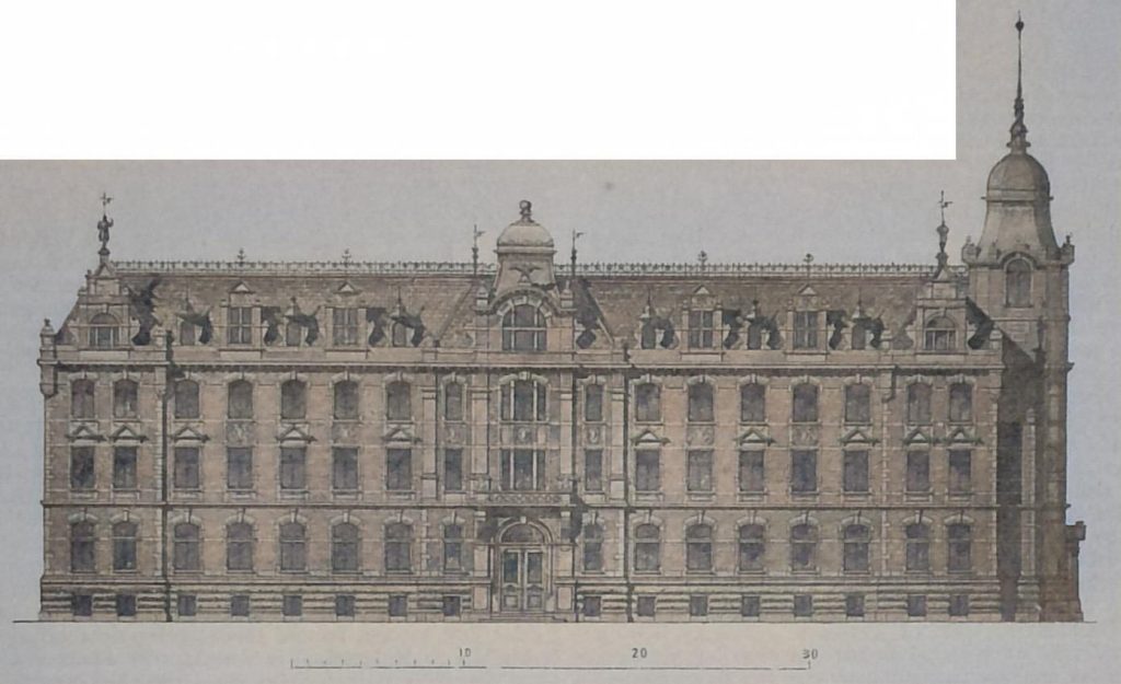 Der zur rechten Seite den Grundstücksgrenzen entsprechend dreiseitig angeordnete Theil des Gebäudes enthält im Erdgeschoss die Dienstwohnung mit besonderem Eingang von der Ecke her. Da das Grundstück fast ganz bebaut werden musste, ist gegen die Seitenstrasse ein Hofraum als kleiner Ziergarten belassen, um dadurch für die Wohnung eine gewisse Annehmlichkeit zu gewinnen. In den oberen Geschossen sind die Vorstandszimmer mit Kanzlei und Sekretariat, sowie das statistische Büreau untergebracht. Die Art der späteren Erweiterung ist auf dem Grundrisse angegeben. Die Ansichten sollen ohne besonderen Aufwand, in Haustein – Gliederungen und Ziegelverblendung für die Flächen, in einfachen Renaissanceformen durchgeführt werden. Der gothische Baustil war, einem Wunsche des Vorsitzenden entsprechend, im Programme ausdrücklich ausgeschlossen.