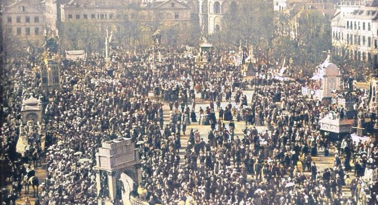 Noch steht diese Feier aus dem Jahre 1812 lebendig vor meiner Seele. In Köln und der Umgegend lagen die verschiedenen Regimenter der kaiserlichen Garde, Cuirassiere, Carabiniers und Dragoner, die Blüthe der Reiterei des napoleonischen Heeres, des Befehls gewärtig, nach Rußland aufzubrechen. Eine Abtheilung dieser stattlichen Panzerreiter veranstaltete 1812 eine pomphafte Begräbnißfeier der Fastnacht. Das Trompetercorps in seinen weißen weiten Mänteln, die Mann und Roß umhüllten, von den blitzenden Helmen wallte der Trauerflor, ritt der Bahre voran, die von einer Abtheilung trauertragender Reiter umgeben war, selbst die silbernen Pauken waren in Trauerflor gehüllt, und dumpf tönte der Trauermarsch vor dem in ernster Stille durch die Straßen nach dem Neumarkte ziehenden Leichenzuge. Ihr Fastnachtspiel war den lebenskräftigen Männern, mit spärlichen Ausnahmen, ein verhängnißvolles Vorspiel ihrer Todtenfeier in Rußlands eisigen Gefilden; sie begruben hier das Kriegsglück der Gottesgeißel des neunzehnten Jahrhunderts.