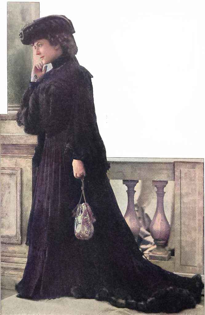 Die drei auf den Porträts der hervorragenden Künstlerin wiedergegebenen Toiletten der schönen „Thérese de Rive“ waren das Chiffonévenement der letzten Tage. Die Schloßherrin erschien zuerst, wie nebensteh. Abb. zeigt, in einer dunklen Visitentoilette aus algengrünem Seidenmusselin über schwarzem Taffet drapiert und von großen Medaillons aus schwazer Chantillyspitze durchsetzt. Den Rand des schleppenden Seidenmusselinrocks umgiebt ein Zobelstreif. Das Mieder aus grünem Seidenmusselin zeigt die Chantillygarnierung boleroartig in zwei kurzen Volantstücken über die Schultern sich legend und in einem zweiten gefalteten Volant bis zum Gurt reichend. Weite Chantillyhalbglocken, über in einem Bündchen endenden grünen Seidenmusselinpuffen, bilden die Aermel und drapierter Seidenmuffelin den Gürtel. Der Hut in Toqueform, an dessen Vorderseite ein Perlenbuckel (Makaron) sichtbar wird, besteht aus einem Gewinde aus grünem Seidenmusselin, schwarzem Taffet und schwarzer Chantillyspitze.