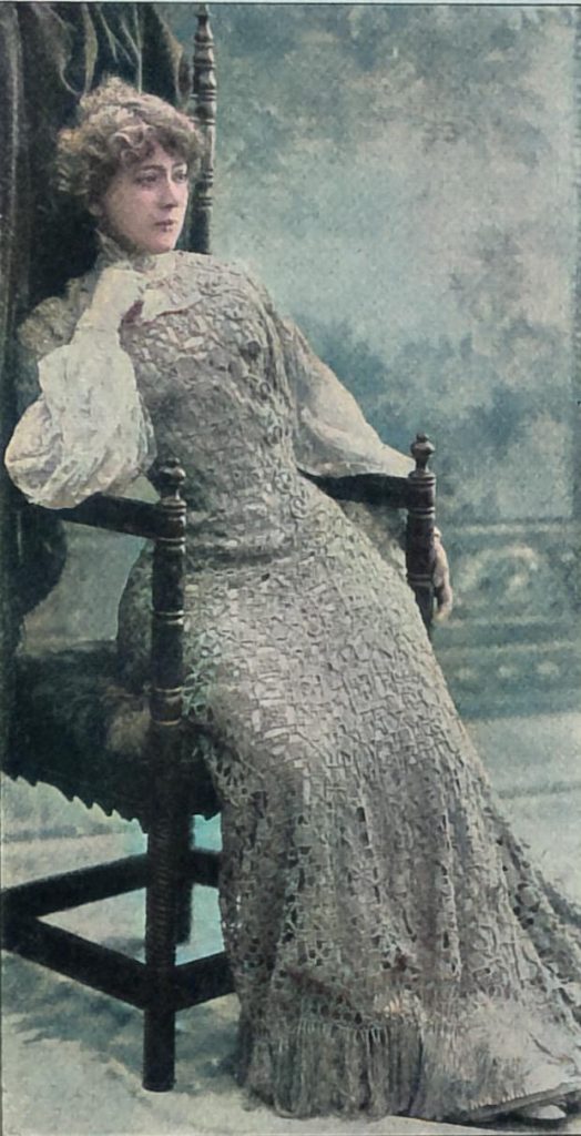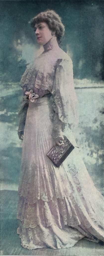 Sehr hübsch ist auch die Sommerrobe (Abb. S. 2271) von Jane Hading aus weißem Seidenmusselin, deren drei den Schlepprock umrandende Volants aus inkrustierten Spitzen bestehn. Die gleiche Spitzeninkrustation garniert die Taille, deren oberer Teil ohne Unterstoff die Haut durchschimmern läßt. Sehr hoher schließender Spitzenkragen und damit harmonierende Manschetten „mitaine“, die die Hand beinah bis zur Hälfte bedecken und den weiten losen Bausch des Seidenmusselinärmels zusammenfassen. Gürtel aus weißem Seidenmusselin mit zwei vollen Rosen an der linken Vorderseite.