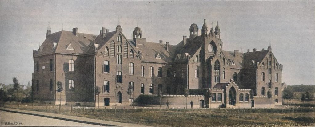 Von der in Backstein-Fugenbau mit Glasurstein-Schichten gestalteten Aussenarchitektur des Gebäudes, die sich durch eine von dem Alltäglichen abweichende individuelle Haltung vortheilbaft auszeichnet, gewährt die hier mitgetheilte, aus der Hansastr. aufgenommene Ansicht der Hinterseite ein bezeichnendes Bild. Zur Eindeckung der Dächer ist englischer Schiefer verwendet worden. Das Innere ist mit einer dem Zweck des Hauses entsprechenden Einfachheit ausgestattet. Die Kellerräume sind durchweg gewölbt, die Treppen massiv auf schmiedeisernen I-Trägern mit eichenen Trittstufen ausgeführt worden. Zur Heizung dient eine von der Firma Rud. Otto Meyer in Hamburg hergestellte Heisswasser-Mitteldruck-Heizung in Verbindung mit einer Luftheizung, welche die vorgewärmte und filterreine frische Luft den in den einzelnen Räumen aufgestellten Heizkörpern behufs weiterer Erwärmung zuführt. Es ist dadurch die Möglichkeit gegeben, im Frühjahr und Herbst sowie in kalten Nächten das Haus mittels der Luftheizung mit frischer temperirter Luft versorgen zu können, ohne die grossen Wasserheizapparate in Thätigkeit zu setzen. Für den Betrieb der Koch- und Waschküche, sowie einer Desinfektions-Vorrichtung ist durch einen besonderen, im Keller liegenden Dampfentwickler gesorgt.
