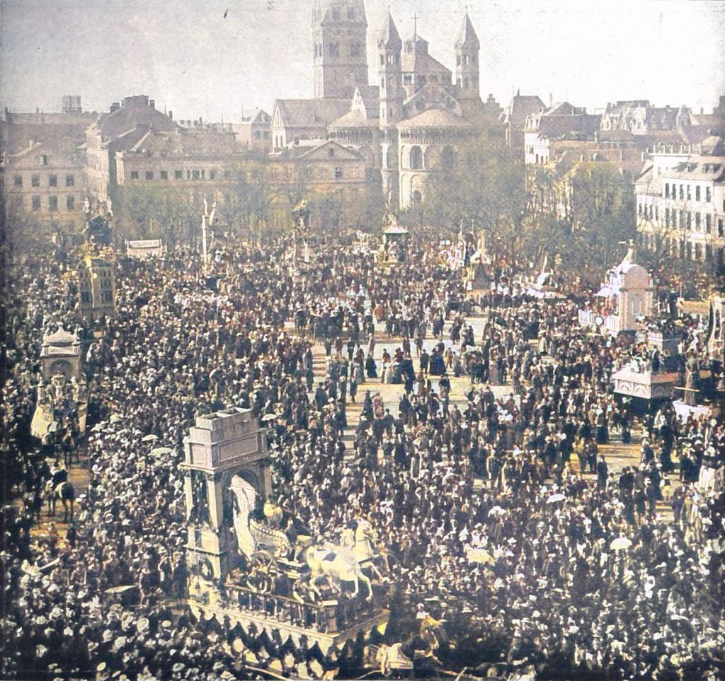 Zu Fußen des Prinzen Karneval kauerte Vater Rhein, weinlaubbekränzt, den Dreizack in der Rechten, und während die Regierungsmanifeste des närrischen Prinzen auf die fröhliche Menge niederflatterten, wehten Tücher aus den menschenbesetzten Fenstern, die Blumensalven fielen in die Wagen, und unzählige Jubelrufe begleiteten den Zug.
