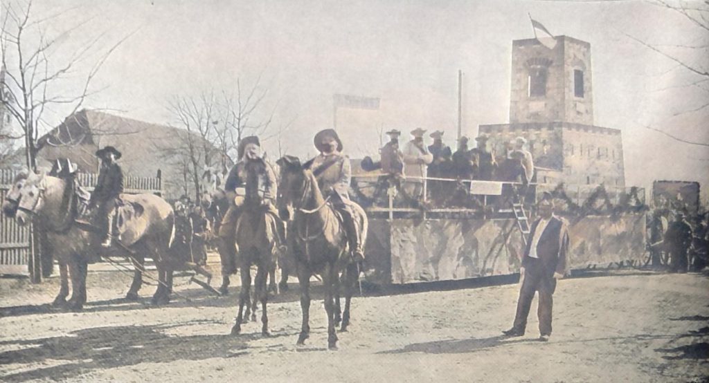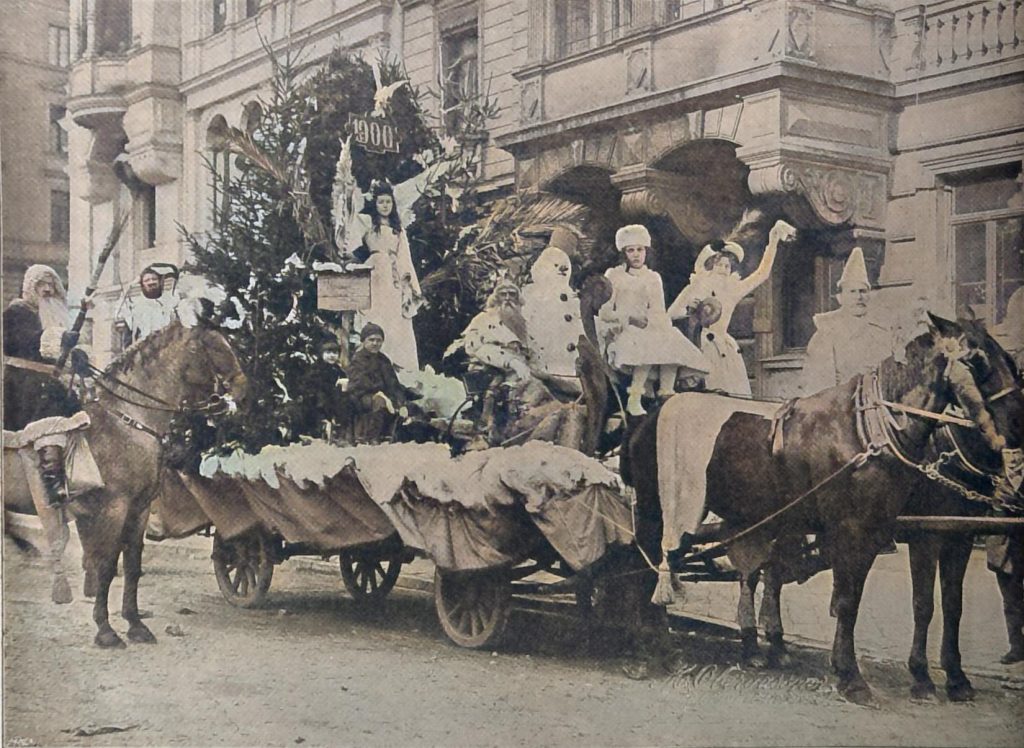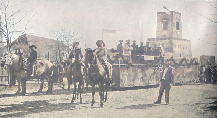 In München nahm der diesjährige Mummenschanz mit einer originell erdachten und glänzend ausgeführten Korsofahrt sein Ende, aus der wir zwei Abbildungen der gelungensten Gruppen wiedergeben. Der Aktualität des Tages, der Burenfrage, trug die berühmte afrikanische Festung „Las mi mit“ (Ladysmith) Rechnung, die eine Schar grimmig aussehender Buren verteidigte, während hinter diesem Wagen ein eiserner Käfig von Pferden gezogen durch die Straßen wankte, in dem Buller, über dessen Haupt die Devise „Für mich giebt’s kein Zurück: flatterte, gemütlich schmauchend saß. Die Gruppe „Winters Abschied!, deren Ausstattung von Schnee und Eis seltsam mit der Wärme des Frühlingstages kontrastierte, Schneemann und Weihnachtsengel, Kolombinen und der Winter selbst in brummiger Person beteiligten sich an ihrem eigenen Kehraus in fröhlichster Stimmung, und sogar Knecht Ruprecht, der die Rute in Händen dem Winterwagen voranfuhr, verlor in der tollen Fastnachtslaune seine Schrecken für die Münchener Jugend.