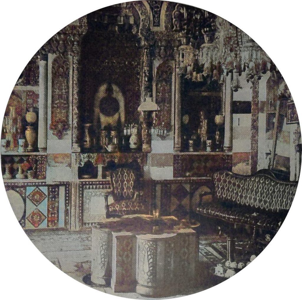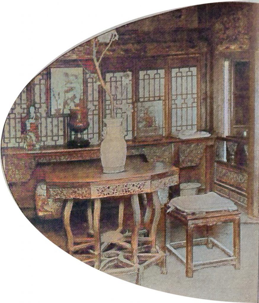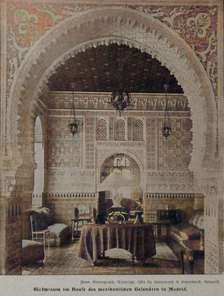 Wie ganz der gleiche Eindruck von harmonisch geordneter Kostbarkeit mit absolut andern Mitteln erreicht werden kann, erläutert sehr charakteristisch das Bildchen aus der Mandarinenwohnung in Tientsin (Abb.). Die Decke, die Wände, der Tisch und sonstiges Mobiliar zeigen übereinstimmend wundervoll zierliches Schnitzwerk in hartem, schwarzem Eisenholz, lebhaft kontrastieren dazu die bunten, herrlichen Seidenstickereien, mit denen die niedrigen Stühle bezogen sind. In breitem Strom ergießt sich das Licht durch eine Fenstergalerie von durchbrochenem Holzwerk, die den feinsten Linienrhythmus offenbart. Orientalischen Luxus in seltsamer Verquickung mit mitteleuropäischer Möbelkunst gewahren wir bei einem Blick in das Haus eines reichen Pascha in Damaskus (Abb. nebenstehend), nicht ohne ein leises Lächeln. In all der feenhaften Pracht arabischer Zierkunst, wie sie in kostbarsten Materialien Wände und Boden deckt, nimmt sich die Hängelampe in all ihrer modernen Spießbürgerlichkeit wie ein drastischer Anachronismus aus! Ein ähnliches Experiment hat sich der mexikanische Minister in Madrid geleistet, indem er seinen Wohnräumen das prachtvoll kopierte Exterieur von Alhambrabauten verlieh. Diese Wunderwerke der Stuckornamentik, der hochgeschweiften Bögen, der zauberhaften Arabesken schließen auch hier moderne Möbel ein. Und das gibt keinen Zusammenklang.