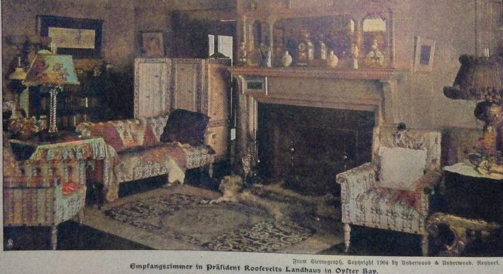 Wie wundervoll echt und harmonisch nimmt sich demgegenüber des Präsidenten Roosevelt Empfangsraum in seinem Land- und Sommersitz in Oyster Bay (Abbildung ) aus. Da bewährt sich ein gediegener, selbstbewußter Geschmack glänzend in der Verwendung von Möbelstücken, die in ihrer Gesamtheit gar nicht einmal einen bestimmten Stil aus machen. Die zarten Holztäfelungen, der apart gestaltete Spiegel über dem Kamin, die bequemen, hellblumigen Sessel und Diwans, die von fern an den Biedermeierstil streifen, die zahlreichen Jagdtrophäen, die Pelze selbsterlegter Grislybären, die wenigen Bilder aus dem amerikanischen Marineleben, dabei die kleine Bücherei – das alles ist so ungezwunen arrangiert und fügt sich doch so natürlich, so behaglich und dabei vornehm zur Einheit zusammen, daß man seine helle Freude an dieser der Wohnungseinrichtung haben kann.
