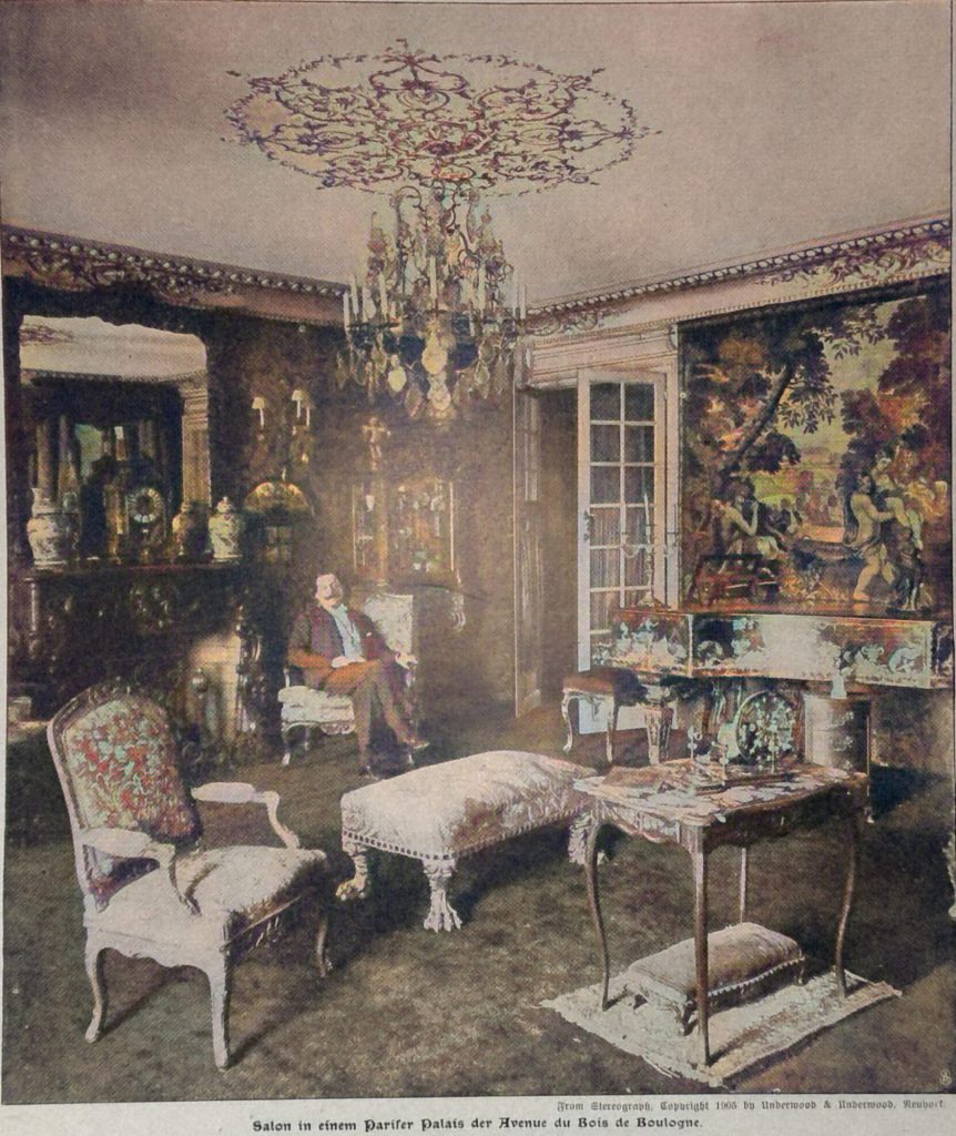 Wir eilen zum Ufer der Seine, nach der Lichtstadt Paris. Da prunkt die große Luxusstraße mit ihren hellen Sandsteinvillen und -schlößchen, die prachtvolle Avenue du Bois de Boulogne. Wir betreten den Salon (Abb.) eines jener beati possidentes, die über des Lebens kleinliche Alltagssorgen erhaben scheinen. Da sitzt er behaglich in dem breiten Sessel an der Kaminecke inmitten der erlesenen Pracht seines Heims, die sich der hier traditionellen Stilmischung von Louis XVI. und Rokokomotiven bedient. Alles strahlt heiteren, graziösen Prunk in diesem Raum. Wäre die etwas schwerfällige, protzige Polsterbank mit den Löwenfüßen in der Mitte nicht, man könnte von einer vollendet geschmackvollen Interieurausstellung reden. Wie prachtvoll malerisch grüßt der Gobelin mit seiner Nymphenszene von der Wand, welche Pracht entfaltet der Flügel den zarte Malereien á la Wattean auf Goldgrund schmücken, wie gefällig stehen die mit teurem Lyoneser Damast bespannten Boulemöbel im Raum. Dann die Haupteigentümlichkeit solcher Pariser Salons, der Marmorkamin, über dem sich der mächtige Spiegel bis zur Decke erhebt, die ganz in weiß mit einer einzigen zentralen Rokokogirlande in Gold strahlt, von der der zierliche Kristallkronleuchter anmutig herabhängt. Ein weicher, einfarbiger Teppich und die großblumigen Seidentapeten erhöhen die Behaglichkeit des Salons, dessen größte Kostbarkeiten wohl in der Glasvitrine zu Häupten des Besitzers aufgestapelt liegen.