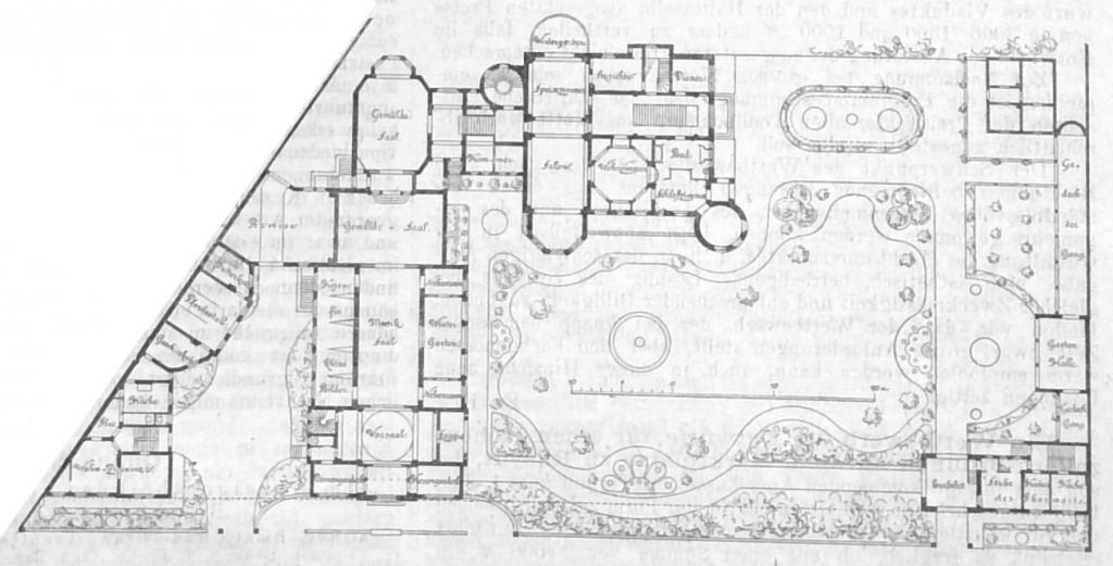 Die einzelnen Bauten selbst sind nicht aus einem Gusse sondern in zwei Abschnitten entstanden. Zunächst wurde i. d. J. 1892-94 das mittlere Haus aufgeführt, das über einem zu Wirthschaftsräumen, Dienerwohnungen usw. verwendeten, durch einen unterirdischen Gang mit den Treibhäusern in Verbindung stehenden Sockelgeschoss im Hauptgeschoss die eigentlichen Wohnräume des Besitzers enthält, Links liegen – als ein einheitlicher Raum behandelt und nur durch eine Brücke getrennt – das mit einem kleinen Gewächshause verbundene Speisezimmer und ein Salon; es folgen ein Empfangszimmer, Bad und Schlafzimmer und endlich im rechten Eckthurm das durch die vorgelegten Räume ausgiebigst isolirte Arbeitszimmer. Im Ober- und Dachgeschoss sind neben einer grösseren Bibliothek eine Reihe von Gastwohnungen bezw. Gastzimmern untergebracht; zugänglich sind dieselben durch die im hinteren Rundthurm liegende Treppe und einen von ihr umschlossenen hydraulischen Aufzug. Das oberste Geschoss dieses Thurms enthält eine Aussichtshalle, dasjenige des vorderen Eckthurms ist für eine Sternwarte bestimmt.