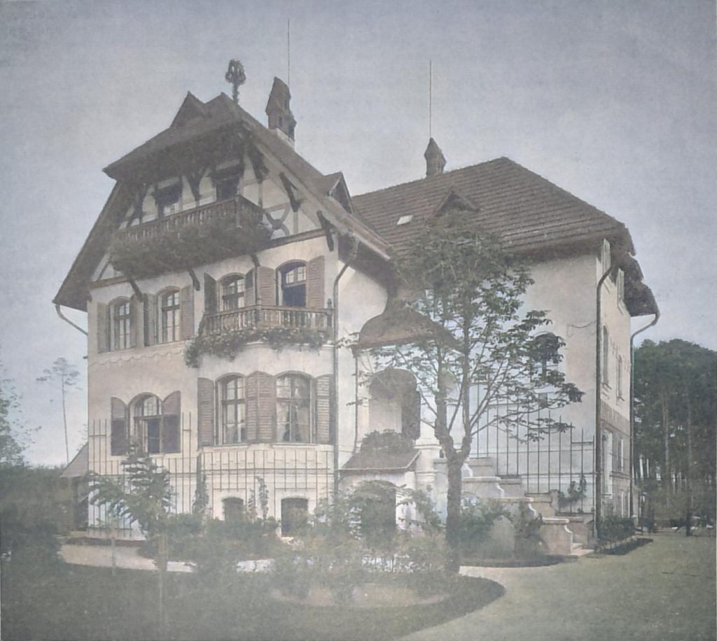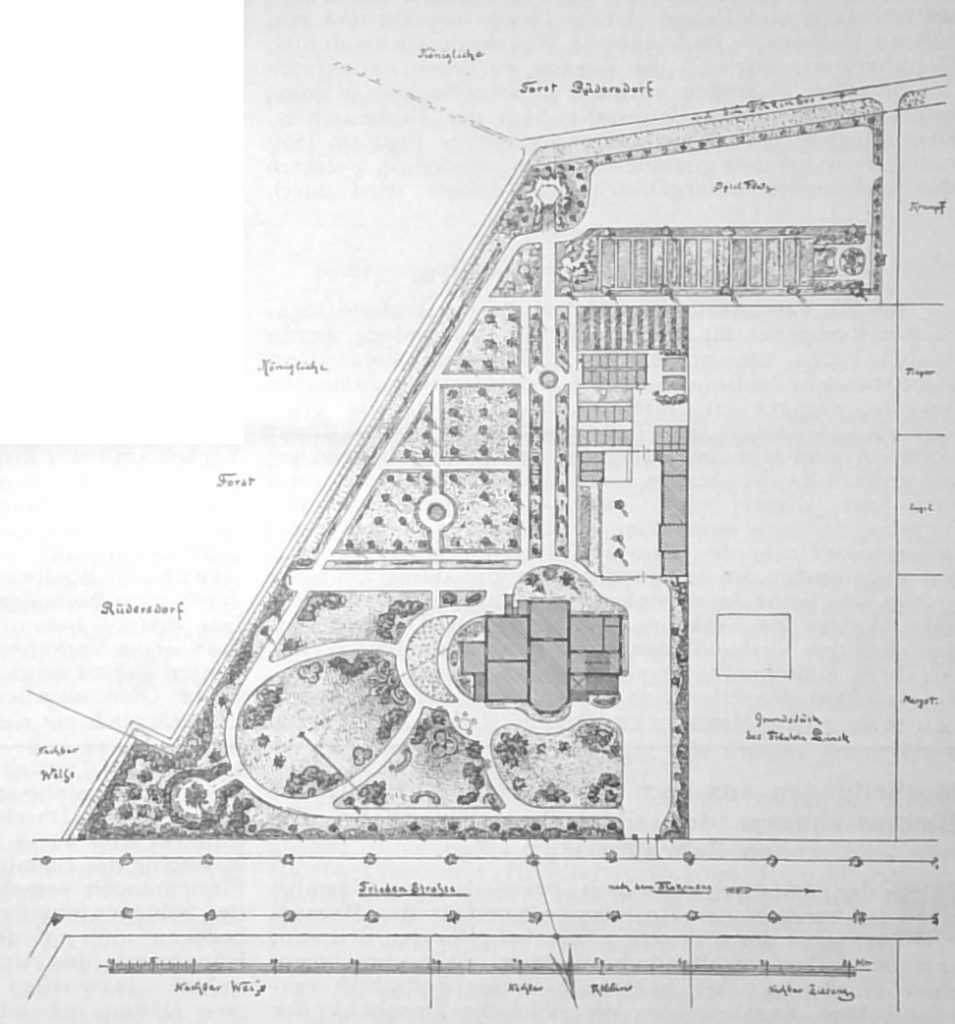 Ein mit zwei Seiten an den Wald grenzendes, an der Friedenstrasse No. 4 gelegenes, annähernd 2 Morgen grosses Grundstück erwarb und bebaute ich im Jahre 1897. Die unregelmäßige Form des Grundstückes gab Gelegenheit zu einer nicht uninteressanten Lösung des Gartenplanes, wie es der beigefügte Lageplan angiebt. Im parkähnlich angelegten Vordergarten wurde, 16 m von der der und 12 m vom Nachbarhaus entfernt, das zunächst für den Sommeraufenthalt bestimmte Wohnhaus ausgeführt. Der nach dem Walde zu liegende rückwärtige Theil des Grundstückes ist der Obst- und Gemüsegarten. Der von Obstspalier eingeschlossene Wirthschaftshof, das Wirthschaftsgebäude, der Geflügelstall mit Voliere, ein eisernes Glashaus für Weinbau, ein Waarenhaus, mehre Mistbeete, der Kesselbrunnen usw. liegen südwestlich vom Hause. Von dem im Schatten des Waldes angelegten Spielplatz gelangt man durch eine Pforte hinaus nach dem Walde.