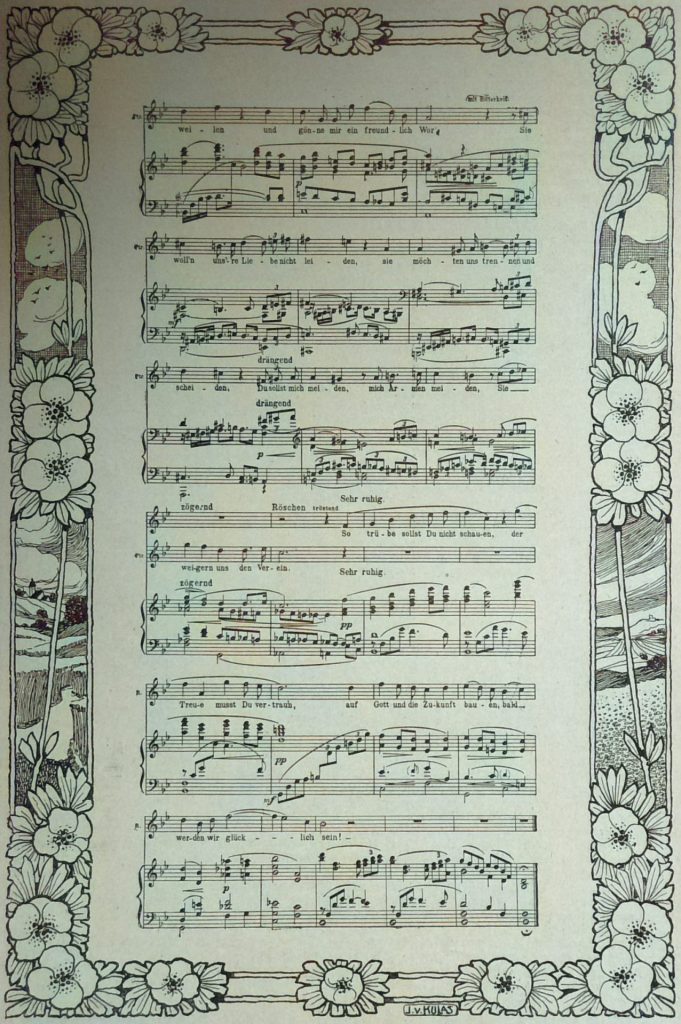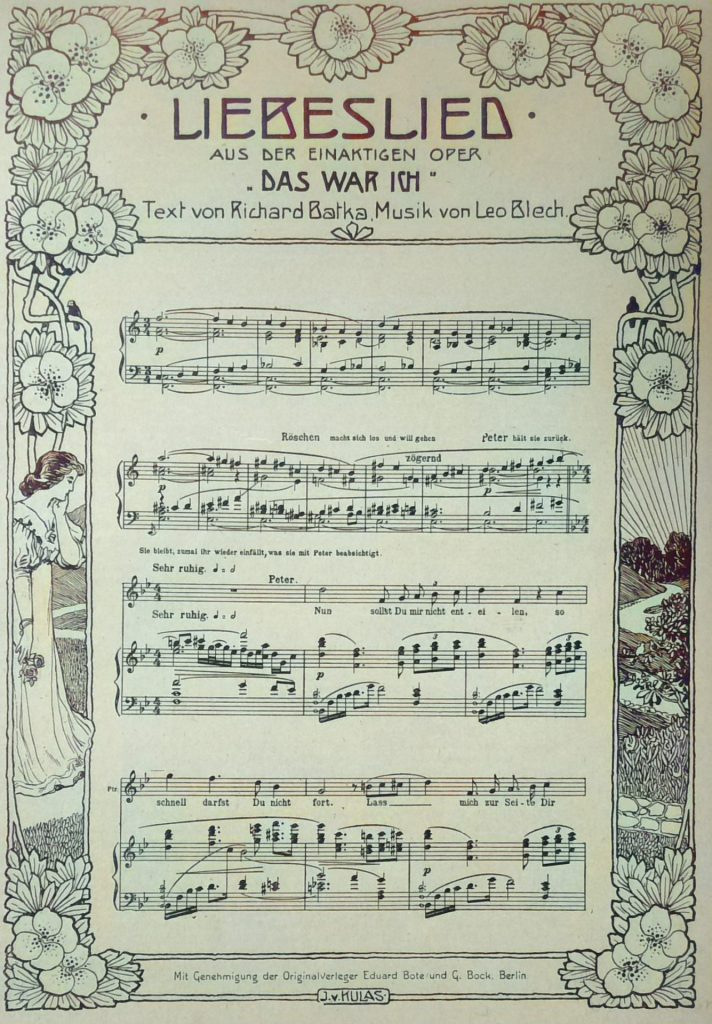 Die ersten Nachrichten, die über Blechs Oper nach außen gelangten, erinnerten lebhaft an die Notiz, die halb mißverständlich, halb scherzhaft seiner Zeit über die eben beendigte „Zarathustra“ -Tondichtung von Richard Strauß veröffentlicht worden war, dahin lautend, Strauß habe sich in dem neuen Werk größter formaler Einfachheit befleißigt und seiner Komposition das Formenschema eines Haydnschen Sinfoniesatzes zu Grunde gelegt. So hieß es auch von Blechs Oper, sie erinnere in ihrer Schlichtheit und ihrem leichten Instrumentalgewand an den Stil Mozarts. Das trifft nun freilich nicht zu, und wer Leo Blech aus seinen sinfonischen Werken kannte, war auch wohl davon überzeugt, daß der begabte junge Musiker schwerlich Neigung dafür besitzen dürfte, urplötzlich alle neuen Errungenschaften aufzugeben und mit den bescheidenen Mitteln einer vergangenen Kunstepoche zu arbeiten. Es steckt ein durchaus moderner Geist in der neusten Schöpfung Leo Blechs. – Die Musikprobe, die wir aus Blechs Oper bieten, mag etwa den Ton charakterisieren, in dem das Stück gehalten ist. Freilich muß hier das eigenartige Orchesterkolorit fehlen und von mancherlei Besonderheiten und ansprechenden Feinheiten im harmonischen, die das ganze Gepräge der Musik wesentlich mitbestimmen, findet sich in diesem Einleitungsstück noch kaum etwas angedeutet. Uebrigens sei bemerkt, daß der Schluß des vorliegenden Fragments nicht in der Originalfassung steht, sondern vom Komponisten für die Veröffentlichung in der „Woche“ freundlichst hinzugefügt wurde.