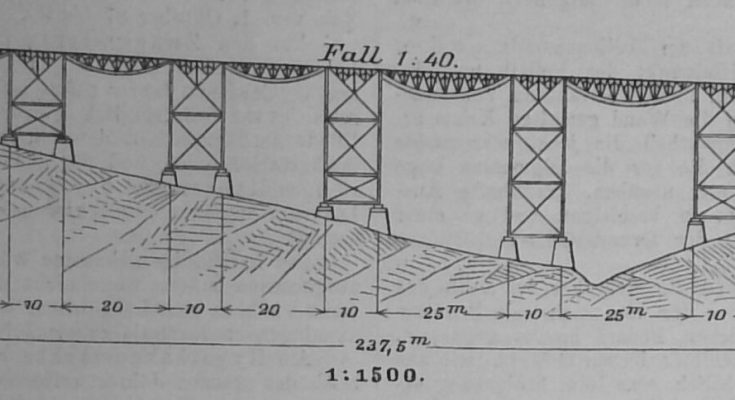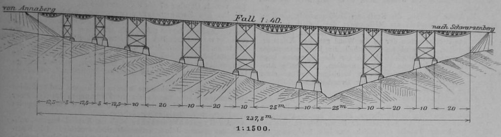 Hierbei macht sich erforderlich, bei den Orten Mittweida-Menkersbach ein Seitenthal in etwa 34 m Höhe zu überbrücken und hierzu dient der Mittweida-Viadukt. Es ist derselbe durch die Sächs. Staatseisenbahn-Bauverwaltung ausgeführt, von Hrn. Reg.-Bmstr. Krüger speziell konstruirt und berechnet worden; er bildet ein gutes Beispiel für die jetzt immer mehr und mehr zur Anwendung kommende sparsamere Verwendung des Eisens infolge rationellster Anordnung und genauerer Berechnung. Der Bau giebt ein Beispiel für die in Deutschland noch kaum vertretene amerikanische Brücken-Konstruktion des Trestle-Work und seine Pfeiler erinnern sehr an die 1875 für die Oroya-Eisenbahn in Peru ausgeführten Brücken Puente de Verrugas und Puente de Andri.