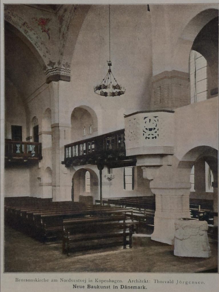Der Blick in das Innere zeigt lebendig, wie auch in der kirchlichen Kunst des Innenraumes nicht eine fromme Dekorationswut herrscht, sondern der Mut zu echter kerniger Einfachheit und Einfalt; ein Stück Granitkunst, die einem wirklich starken protestantischen Glauben so gut ansteht. In diesem Sinne sehe der Besucher Kopenhagens sich besonders die Immanuelkirche an, die sich die freie Gemeinde in Kopenhagen gebaut hat; in diesem stimmungsvollen Bau von A. Clemmensen kann man auch die tiefgründige, dekorative Malkunst der Brüder Skovgaard bewundern, die mit ihrem Freunde, dem Charakterkopf Th. Bindesböll, heute die stärksten Persönlichkeiten in der dänischen Dekorationskunst sind.