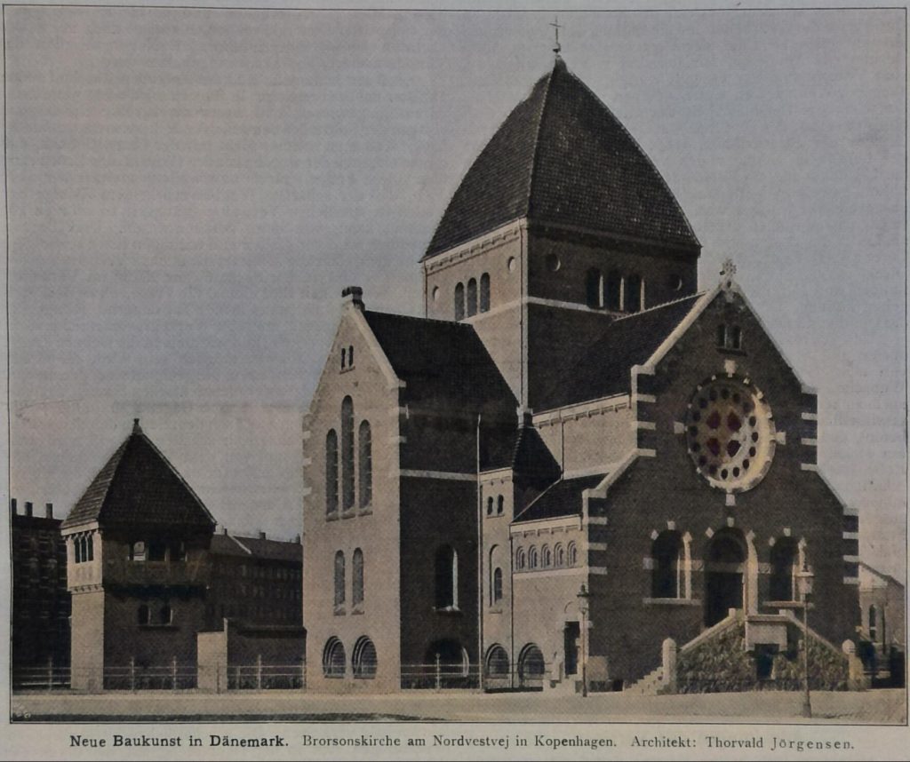Der neuere Kirchenbau verdient später ein eigenes Kapitel. In Kopenhagen sind in den letzten Jahren eine Reihe kleinerer, höchst eigenartiger Kirchen entstanden. Das Schema der Reißbrettgotik scheint völlig überwunden. Reizvolle Gruppen von verschiedenster Gestalt, mehr von den romanischen Landkirchen als von Monumental – Vorbildern abgeleitet; als Material vorwiegend Ziegel mit maßvollem Werksteinschmuck; die Ornamente kräftig, aber bescheiden und auf die Hauptpunkte beschränkt. Wir geben als Beispiel die Brorsonskirche von Thorvald Jörgensen, am Nordvestvej gelegen; der Kirchenraum ist für 800 Plätze berechnet; im Sockelgeschoss liegen Sakristei und Versammlungssäle; der Glockenturm links daneben.