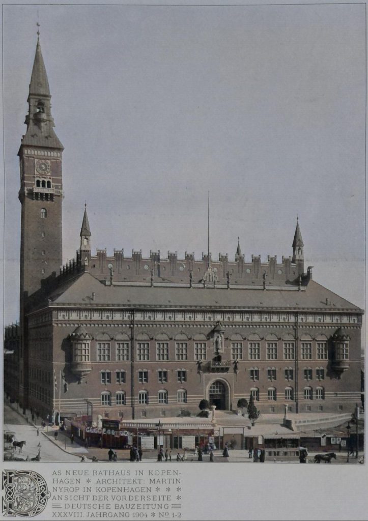 Die dänischen Architekten werden es für recht und billig halten, wenn wir unter den Werken und unter den Meistern von heute das neue Rathaus von Kopenhagen und seinen Schöpfer Martin Nyrop voranstellen. – Er ist schon frühe als eine starke Persönlichkeit bekannt geworden, als er im Jahre 1888 der nordischen Ausstellung in Kopenhagen ihr eigentümliches, frisches Gepräge gab und die heimischen Motive des nordischen Holzbaues mit starker künstlerischer Laune zu einer wirklichen Gelegenheits-Architektur verarbeitete; eine der frühesten Taten echter Ausstellungskunst, wie sie noch 1900 auf der Pariser Weltausstellung eigentlich nur die skandinavischen Nationen gewagt haben. Er hat dann für den Staat das Provinzialarchiv in Kopenhagen gebaut; das gewaltige, ganz schmucklose Magazin getrennt von der gefälligen Baugruppe, welche die Studien- und die Verwaltungsräume enthält, nur durch einen Gang mit ihr verbunden; ein Charakterbau echten Schlages. Als Sieger eines Wettbewerbes hat er seither die gewaltige Aufgabe durchgeführt, einer großen, modernen Stadt ein Rathaus zu schaffen, das zugleich Nutzbau und Festbau sein soll. 1894 ist der Grundstein gelegt worden; im Januar 1903 ist es endgültig bezogen worden; jetzt wird noch an dem Ausbau des grossen Hauptfestsaales gearbeitet.