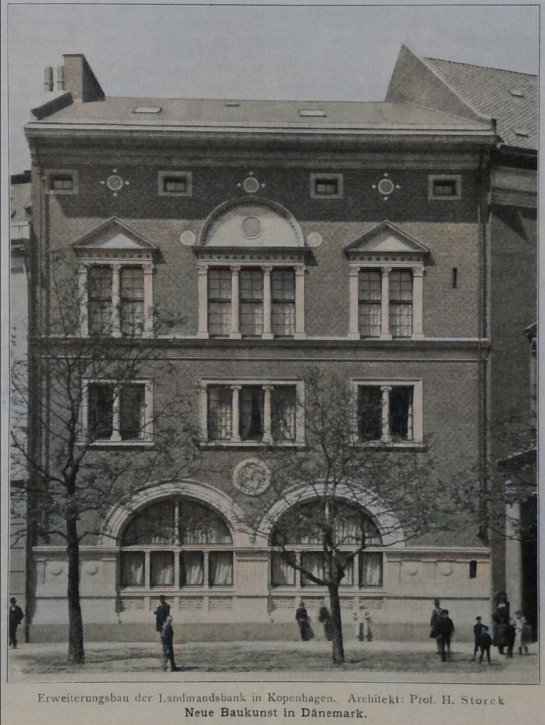Man findet Belege dafür, dass der Sinn für gesunde Schlichtheit im Anschluss an alte, heimische Bauweisen nicht einmal aus allerjüngster Zeit stammt. So steht unter den vielen Stiftungsgebäuden, die eine Eigentümlichkeit Kopenhagens bilden, aus den Jahren 1885 bis 1887 das Abel Cathrine’s Stift von H.Storck; ganz in den schmucklosen Backsteinformen der dänischen Barockkunst aufgeführt, mit einem kleinen Hof, der mit seiner schlichten Kapellenfront, von Grün überwuchert, mitten in der Großstadt wie ein Hort tiefsten Friedens anmutet. Ein zweites Stiftshaus von demselben Künstler liegt frei hinter einem der großen Zierteiche der äußeren Stadt, das Soldenfeldts-Stift am Sortedams-See: eine große eckige Fassade von ruhiger, monumentaler Würde; die leuchtende, rote Ziegelfläche unter dem glatten, einfarbigen Dache spiegelt sich in wundervollem Farbenklang auf der blanken Wasserfläche wieder. Der Meister wird auch besonderen Aufgaben sieghaft gerecht: bei dem Erweiterungsbau der Landmandsbank, galt es, neben dem Ziegelstein besonders reichlich norwegischen Marmor zu verwenden; man sieht, wie fremdes Material und italienische Motive mit dem heimischen Backstein und dem nordischen Raumgefühl in eins gestimmt werden.