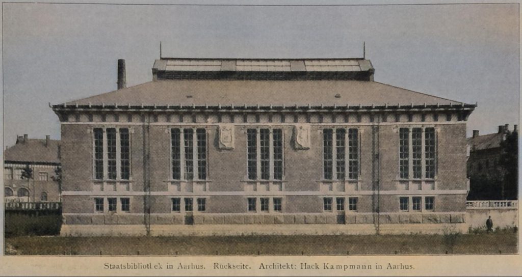 Als die vielseitigste Persönlichkeit neben Martin Nyrop darf Hack Kampmann gelten. Als der Staat i. J.1888 das Archiv in Kopenhagen an Martin Nyrop übertrug, erhielt der jugendliche Kampmann gleichzeitig das Archiv in Viborg (Jütland) in Auftrag. Seine weiteren Werke stehen in Aarhus, der größten Stadt Jütlands, die im Laufe des 19. Jahrhunderts von 4000 auf 50 000 Einwohner gewachsen ist. Hier hat er als Königlicher Bauinspektor das Zollgebäude und die Staatsbibliothek gebaut, ferner für die Stadt das Theater und für einen Prinzen (als Geschenk der Nation) ein Landschloss; auch für die Stadterweiterung hat man ihn mit Plänen beauftragt. So verschiedene Aufgaben hat er in wechselnden Formen, aber in einem Geiste kraftvollen Ernstes gelöst. Das Zollgebäude (Zollkammer) ist ein Eckbau; an der Ecke ein hoher eckiger Turmbau zwischen zwei kernigen Rundtürmen, das Motiv des Stadtwappens von Aarhus; daneben die schlichten Flügel unter hohen Dächern; das Material Backstein in anmutiger Musterung, versetzt mit sparsamem Haustein. Sachlich und vornehm zugleich erscheint das Gebäude der Staatsbibliothek . Es liegt ganz frei und enthält aussen ringsum die Bücherräume. Die Fenster sind zu großen Gruppen zusammengefaßt, namentlich an der Rückfront, die unsere Abbildung zeigt; an den Mauerflächen dazwischen steht in großem, sicherem Rhythmus ein Paar kräftiger Wappen; über den Ziegelstein-Fassaden steigt das schräge Dach bis dahin, wo die inneren Mauern heraustreten und das große Oberlicht für den Lesesaal tragen, der in der Mitte des Gebäudes liegt. Da das Gelände ansteigt, so liegt die Vorderfront mit dem Eingang höher, an einer Terrasse. Eine Brücke führt zu dem Portal mit seiner eigenartigen Flächen-Verzierung aus Tauwerkmotiven.