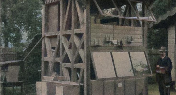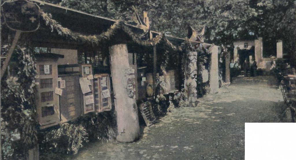 Die oben erwähnte Ausstellung enthielt sehr vieles, was auch weitere Kreise lebhaft interessieren konnte und wovon wir einiges hier im Bilde festhalten. Da sehen wir die alte geschnitzte „Klotzbeute“, sie stellt die einfachste und älteste Form einer Bienenwohnung dar, ist jedoch überall, wo mit Erfolg und Nutzen Bienenzucht getrieben wird, nicht mehr im Gebrauch, sondern durch den bekannten Bienenkorb verdrängt. Die Klotzbeute bietet nur noch historisches Interesse. Die photographische Aufnahme von Bienenwohnungen verschiedener Systeme zeigt in reicher Auswahl mannigfache Bienenbehausungen, wie sie, mit Ausschluß der Klotzbeuten, heute auf dem Imkerstand angetroffen werden, und giebt eine lebendige Vorstellung, in wie verschiedener Weise die Bienenzucht betrieben werden kann. Das dritte Bild zeigt die zeitgemäßeste und besteingerichtete Bienenwohnung, einen Pavillon für zehn Bienenvölker nach dem System des Pfarrers Gerstung. Dieses sinnreiche System bürgert sich jetzt mehr und mehr auf den Bienenständen ein und wird die bekannten Strohkörbe vielleicht ganz verdrängen, da sich in ihm die Arbeiten des Imkers mit grober Leichtigkeit und Einfachheit vollziehen lassen.
