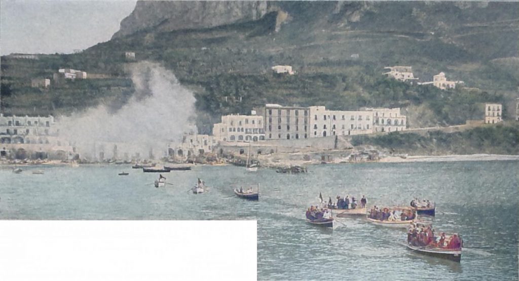 Man erlebt, daß sich die Menschen erschreckt die Augen zuhalten und unwillkürlich hilfesuchend sich an den Nachbar drängen, man hört aber auch in Amerikanisch-Englisch: „Oh, beautiful! delightful!“ – In Schwefeldampf und Rauch geht’s hinauf, oft lassen sich ängstliche Seelen tragen, andere werden geführt bis zum Krater – und hustend und prustend kommt man zurück. „Da unten aber ist’s fürchterlich“ Den Blick in die Werkstatt Vulkans, die Mühe, die Absonderlichkeit der Stunde feiert man dann im Restaurant bei Lacrimae Christi – und läßt in dem glühend die Adern durchtobenden Vesuvwein leben, was daheim, was man liebt – was man erhofft. Und ein Weltweiser sitzt wohl neben der aufjauchzenden Jugend und lächelt – „abgelaufen hab ich das an den Sohlen schon!“