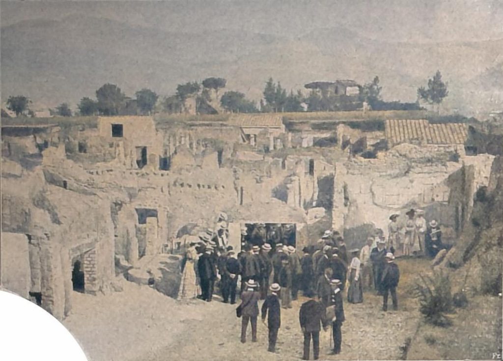 Pompeji bietet nicht mehr nur den Archäologen ein Bild alter römischer Städte, der gebildete Reisende freut sich des Anschauungsunterrichts; er durchwandert die Straßen mit den vor zweitausend Jahren ausgefahrenen Gleisen mit stillen Gedanken, liest das cave canem und sitzt auf der Gräberstraße auf der Bank „der Mamia“. Und der nicht von den geringsten Wissensqualen Beladene macht sein harmloses Gesicht wie vor irgendeiner Schaufensterauslage daheim: „Nee, nu aber! Was ist denn das auch?“ Die funniculi, die Drahtbahn, führt bis zum Kegel des Vesuvs – sie gewährt den Niederblick auf durchschnittene Lavaströme und in furchtbare Abgründe.