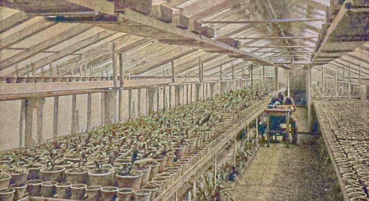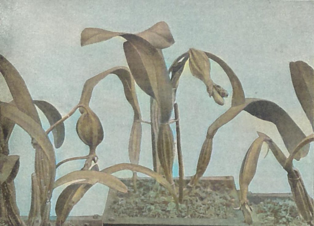 Der Samen wird zuerst grün und treibt auf einer Seite einen sackförmigen Auswuchs, aus dem die ersten Blättchen hervorkommen. Das erste Würzelchen ist mit feinen Saughaaren bedeckt. Das ganze Individuum liegt nur lose auf der Erde auf und wird in der Natur vom Wind vertragen. Wenn dieses Stadium eintritt, muß der Gärtner darauf bedacht sein, dem Pflänzchen neuen Nährboden zu geben, denn der alte hat nicht mehr Kraft genug, um sie im raschen Wachstum zu ernähren. Nun kommt eine furchtbare Geduldprobe. Die Pflanzen sind so klein, daß der Gärtner sie mit dem bloßen Auge kaum wahrnehmen kann, deshalb nimmt er mit der im Auge eingeklemmten Lupe das Umsetzen vor. Er hat ein haarfein zugespitztes Stäbchen, mit dem er die Pflänzchen aus dem Nährboden wegholt und sie auf den neuen Nährboden legt. Diese Operation muß bis zum Erscheinen der eigentlichen Wurzeln mehreremal wiederholt werden, besonders wenn sich auf dem Nährboden Schimmelpilze zeigen. Nach dem ersten halben Jahr, wenn sich die jungen Keimlinge bewurzeln, müssen sie einzeln in kleine Töpfe gesetzt werden. In diesen Töpfen bleiben sie längere Zeit, bis sich ihre Wurzeln stark entwickeln. Die Töpfe müssen möglichst nahe ans Licht gerückt und nur gegen die heißeste Mittagssonne geschützt werden; auch müssen sie mit guter Drainage versehen sein. Erst wenn die Wurzeln den Topf ausfüllen, wird wieder versetzt. Im neuen Topf darf dann kräftigere Kost sein, faseriges Erdreich mit englischem „Pit“ (Farnwurzelerde) vermischt. So wachsen die Pflanzen weiter, bis sie im vierten Jahr Blütenansätze zeigen. Wenn sie schon größer sind, können sie je nach der Gattung in Körbchen oder Töpfen weiterkultiviert werden. Cattleyen, Deutrobien, Wanden, Oncidien entwickeln sich besser in hängenden Körben, Masdevallien, Cypripedien und alle Erdochideen kommen in Töpfe. Die Erfahrung hat gezeigt, daß die aus Samen gezogenen Pflanzen viel schönere Blumen erzeugen als die alten Kulturpflanzen.