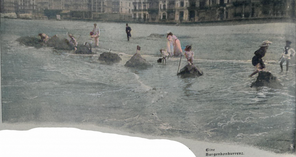 Aber das Endziel der meisten ist keineswegs die elegante Promenade vor dem terrassengeschmückten Häusermeer, sondern der prächtige, weiße Strand, wo groß und klein, frei von lästigem Toilettenzwang, sich einem göttlichen „dolce far niente“ und kindlichem Spiel hingeben und in ungezwungener Ausgelassenheit nach Herzenslust herumtummeln können, wenn sie nicht zu jenen gehören, die sich nur im Strudel des gesellschaftlichen Lebens oder gar bei Spiel und Trank wohl zu fühlen glauben.