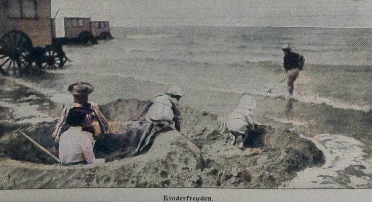 Der Ostender Strand, den man mit Recht das Paradies der Kinder zu nennen pflegt, bildet ein Reich, ja eine Welt für sich, von der die Kleinen träumen wie von einem Märchenland. Keine noch so reich ausgestattete Kinderstube, kein noch so prächtiger Garten und kaum ein anderer Strand Europas bieten ihnen so manigfaltige, so herrliche Freuden wie die gefahrlose, ideal gelegene „Plage“ Ostendes, die zweifellos für die Mehrzahl der alljährlich wiederkehrenden Besucher die größte Anziehungskraft des bekannten Seebads bildet.