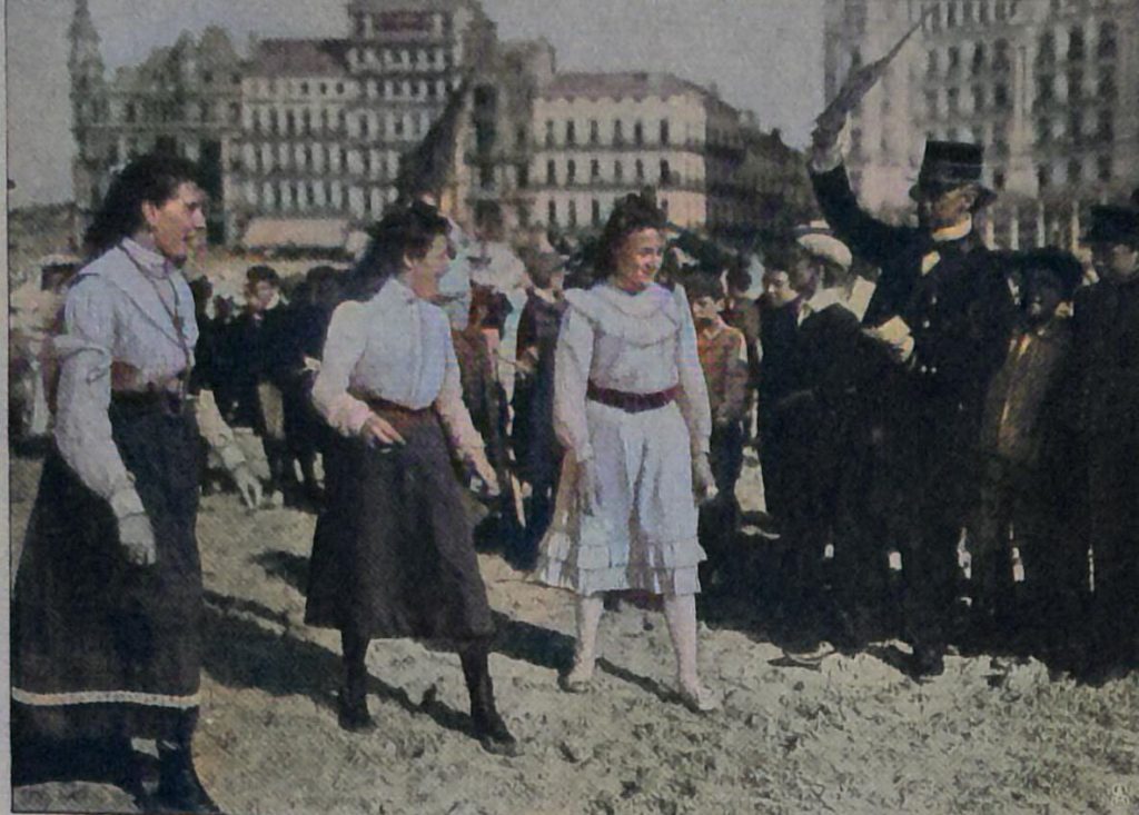 Kostbare Toiletten rauschen an einem vorbei, englische Lords, deutsche Grafen und französische Ducs wandeln durch die bunte Menge, Gigerl, Modenarren und Abenteurer jeder Nationalität schlendern müßig auf und ab, fröhliche Kinder tollen spatenbewaffnet hinter ihrer „Mademoiselle“ her, Badelustige eilen in Scharen den Freuden des Seebads entgegen – kurz alles, was Beine hat, hat sich auf dem breiten Pflaster der schier endlosen Digue ein Rendezvous gegeben.