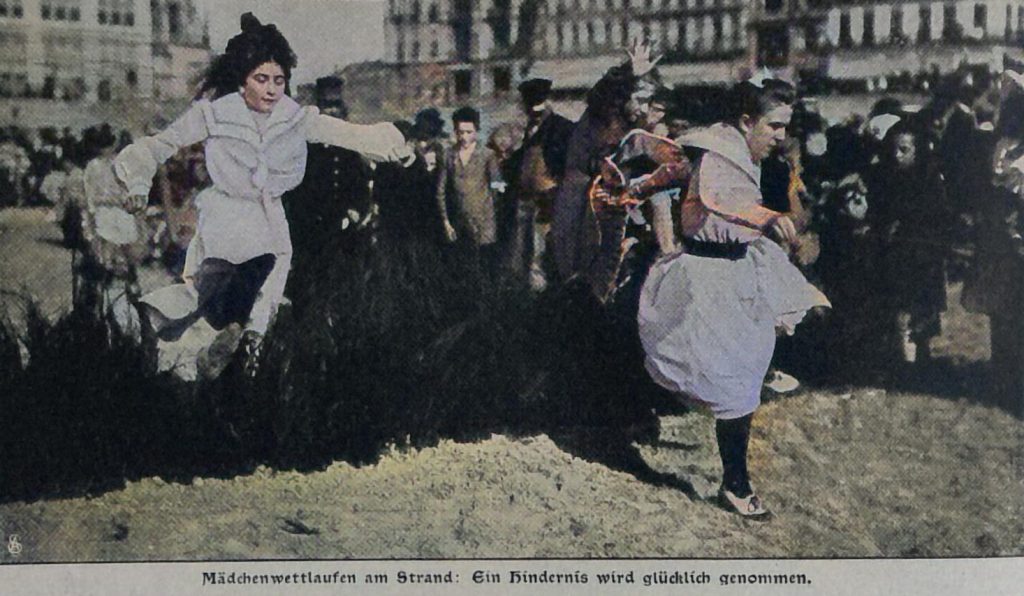 Aber was tut man auch nicht alles für die kleinen Badegäste, um ihnen die Freude am Dasein zu erhöhen und ihr Wohlbefinden zu fördern! Auch das Kinderleben muß man vor Eintönigkeit zu schützen suchen, und wenn die Erwachsenen sich am Sport erholen und stärken, soll man den Kleinen die Vorteile gesunder Bewegung erst recht zugute kommen lassen. Das hat man in Ostende sowie in andern belgischen Seebädern schon längst erkannt. In interessantem, den Ehrgeiz und die Verträglichkeit förderndem Wettbewerb läßt man daher die Mädchen und die Knaben um die Wette laufen, springen und Sandburgen graben, und wie anders wirkt das als die eintönige, leere Spielerei! Davon kann man sich dort am besten überzeugen, wenn man die fröhlichen, originellen Spiele der internationalen Kinderschar beobachtet, die den Ansporn geben zu geselligem Verkehr und einem dem Kind so nützlichen Austausch von Gedanken.