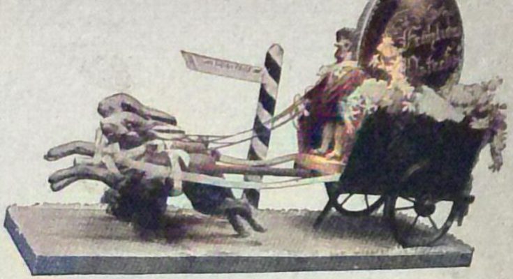 Der liebe, gute Osterhase! Nun hat auch er sich der „modernen Richtung“ angeschlossen! Tapfer erfüllt er seine schweren Pflichten im Sezessionsstil und à l’empire, nichts Künstlerisches bleibt ihm fremd!