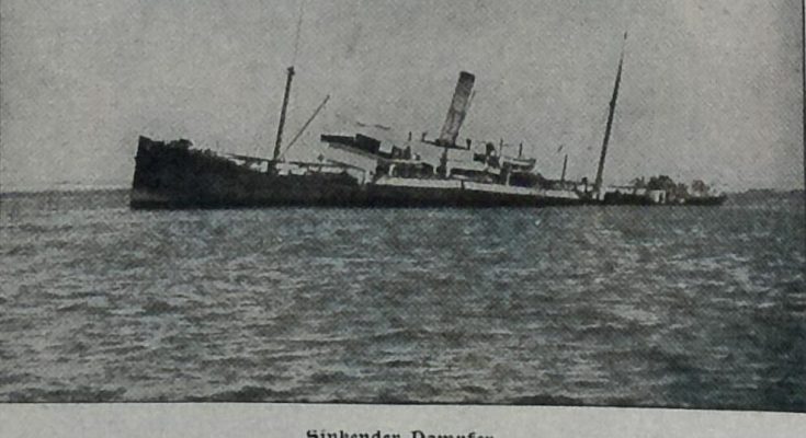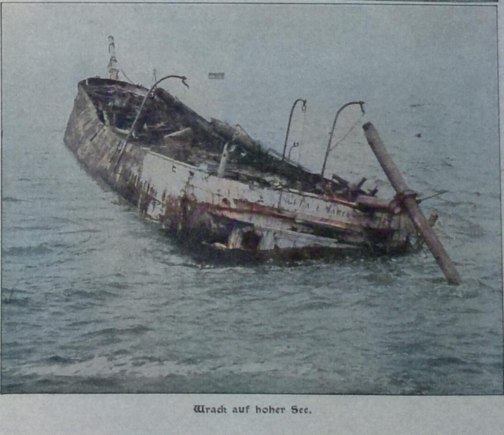 Die Zerstörung gestaltet sich einigermaßen schwierig wenn ein Wrack kieloben treibt. Es muß dann erst von der Mannschaft erstiegen, auch müssen entsprechende Oeffnungen geschlagen werden, damit man das Dynamit in richtiger Weise anbringen kann.