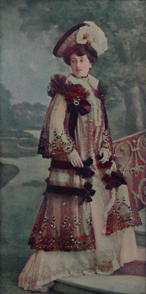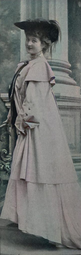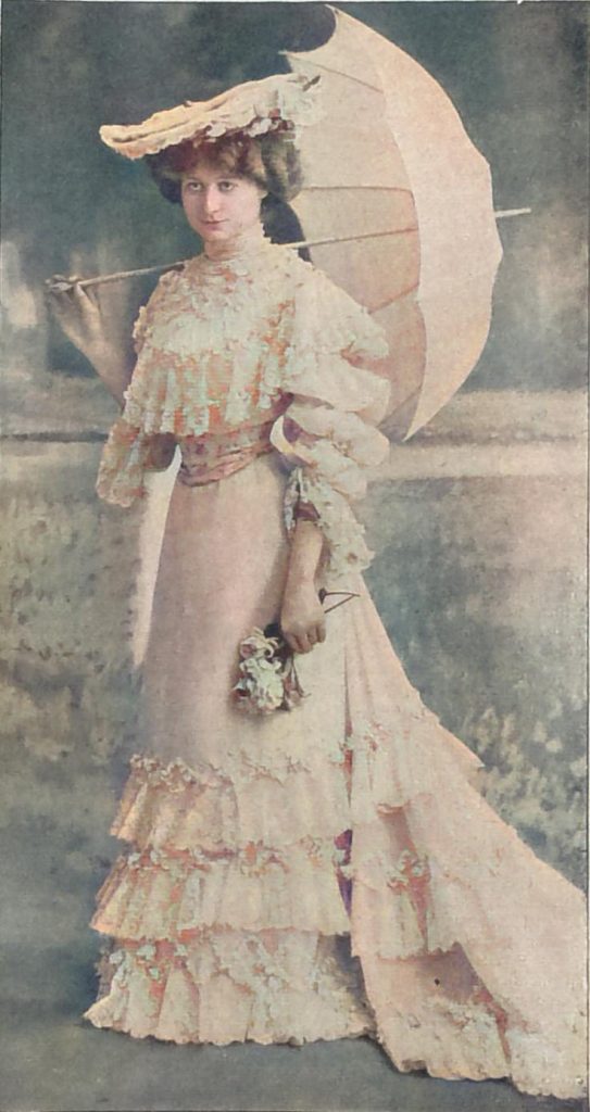 Als wärmendere Abendhülle nenne ich den weiten Sackmantel aus Tuch oder aus Taffetseide. Letzterer Stoff gewinnt durch ein gepufftes und gerüschtes Krepp- oder Seidenmusselinfutter noch an Eleganz. Mein Modell (Figur 4) aus mattgelbem, elfenbeinartig schimmerndem Tuch erinnert in seinem Kragenarrangement an den sehr hübschen, noch immer beliebten „Aiglon“, durch Sarah Bernhardt zur Unsterblichkeit berufen; die breite Falte in dem nahtlosen Rücken und die weiten bequemen Aermel, die nach Belieben offen getragen oder vermittelst seidener Schnurösen an die Knöpfe befestigt werden, neigt zum Genre „sac“ hin. Schwarzer Strohhut mit goldigschimmernden Fasanenfedern und weißes Organdikleid, dessen unterem Rocksaum zahlreiche schmale Fältchen Halt und Konsistenz geben. Das Kostüm ist in hellen Stoffen hergestellt, vorzüglich für die morgendliche Strandpromenade geeignet; ich sah das gleiche Modell, das Kleid aus blauem Etamine und den Paletot aus graubrauner („fumée“) Taffetseide mit gelblichem Pongeefutter hergestellt, ein eleganteres, dabei nicht unpraktisches Reisekostüm ist kaum denkbar. Die meiste Phantasie entwickelt die jetzige Sommermode in der Herstellung von Waschkleidern, die in Paris und seinen „Dépendancen“ bis jetzt nie recht beliebt waren und nicht heimisch wurden. Es muß wirklich der Widerspruchsgeist der Modisten und ihrer ausschlaggebenden Klientinnen gewesen sein, der diesem miserabeln Frühjahr zum Trotz wahre Orgien in Musselin, Tüll, Organdi, Spitzen und Mull arrangierte. Jetzt unter der wärmeren Sonne entfalten sich diese echten rechten Sommerkleider aufs prächtigste und zeigen, wie Figur 2, einen großartigen Aufwand an Spitzenschmuck. Dieses Kleid aus feinstem rosa Mull über rosa Seide, aber lose, so daß es leicht waschbar bleibt, gearbeitet, hat auf seinem Schlepprock drei von rosa Mullrüschen überragte Spitzenvolants. Das plissierte Mieder und die in drei Puffen geordneten Aermel zeigen volantartige Spitzengarnierung. Drapierter Gürtel aus rosa Taffet mit Pompadourblumenmuster. Der Hut ist eine Toque aus rosa Krepp, mit weißen Spitzen und rosa Nelken garniert, die sich der modernen welligen Scheitelcoiffure kleidsam aufschmiegen. Rosa Taffetschirm.