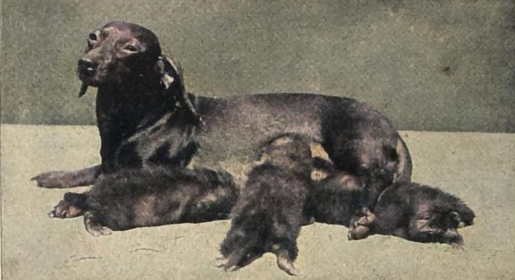 Namentlich weibliche Tiere haben den Trieb, sich kleiner verwaister Wesen anzunehmen. Dabei kommen die sonderbarsten Freundschaften vor. So zeigt unser zweites Bild eine Hündin, die drei kleine Marder adoptiert hat.