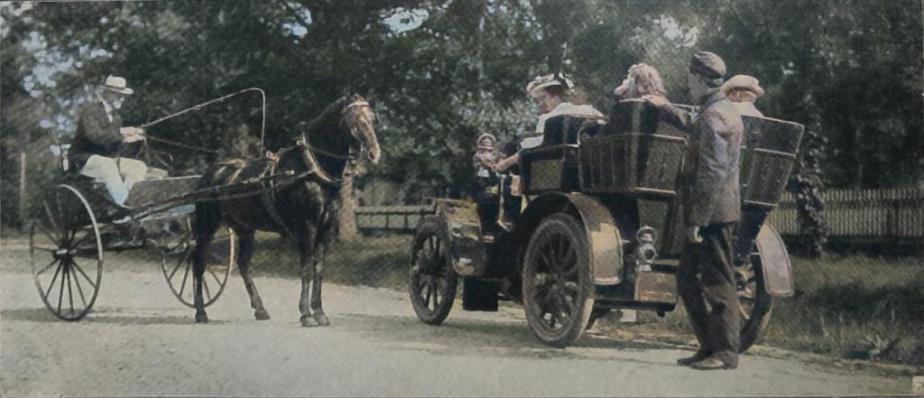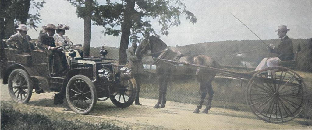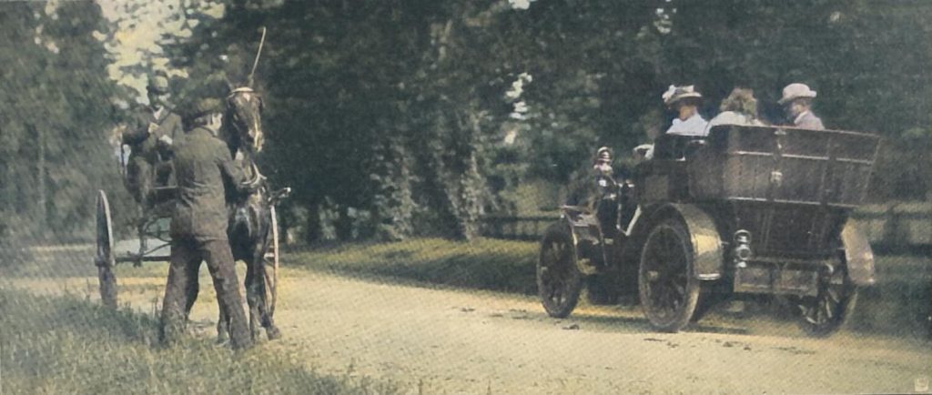 Auf die nervöse und scheue Natur des Pferdes machen alle ungewohnten neuen Erscheinungen einen verwirrenden Eindruck, und besonders das Automobil oder, wie man in Süddeutschland gemütlich sagt, das „Schnauferl“ jagt dem Pferd anfangs einen gewaltigen Schreck ein.