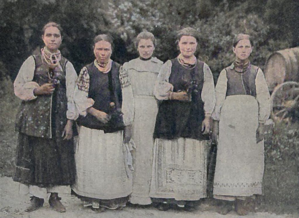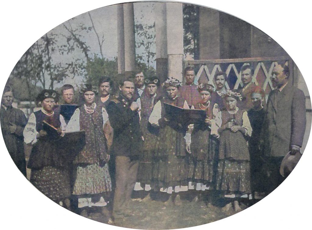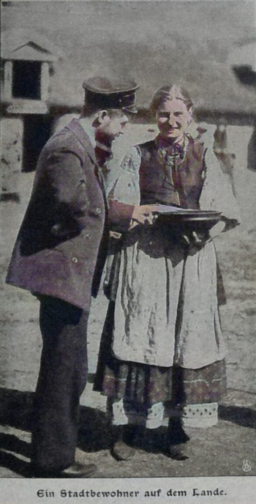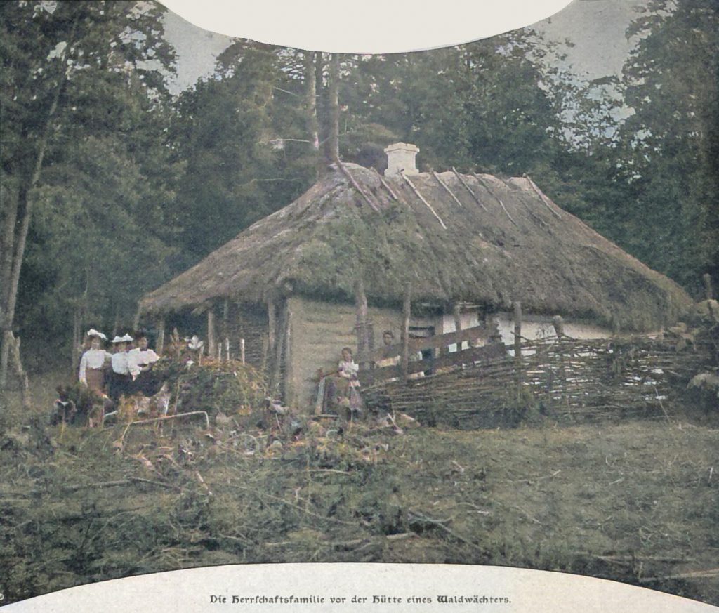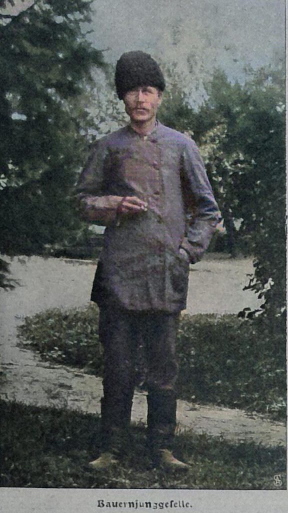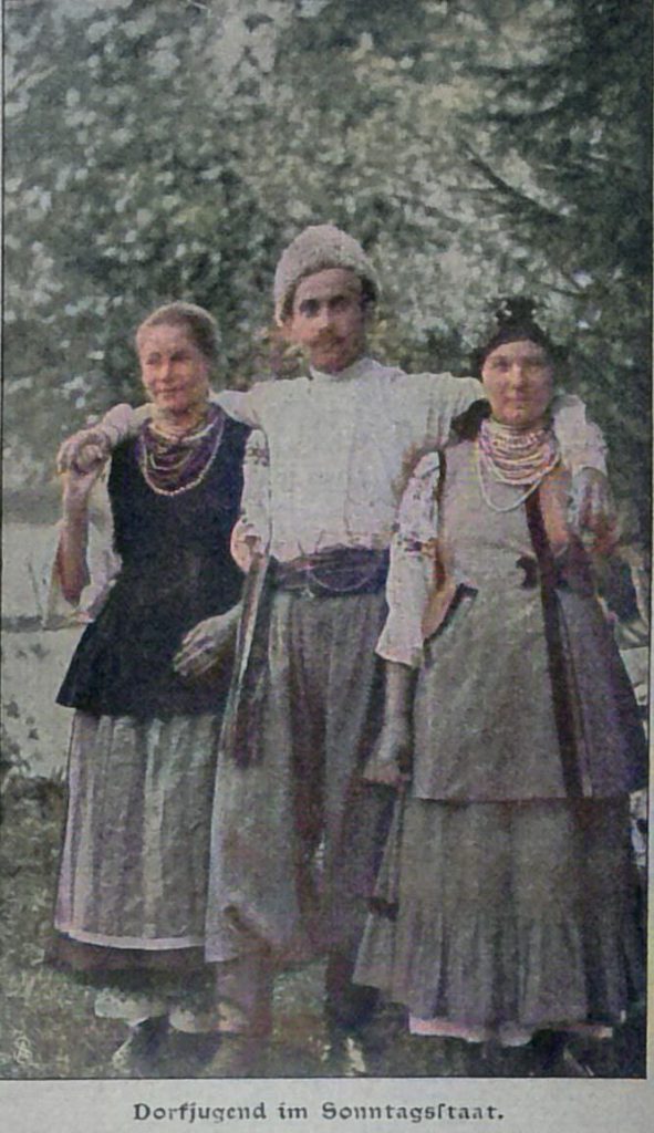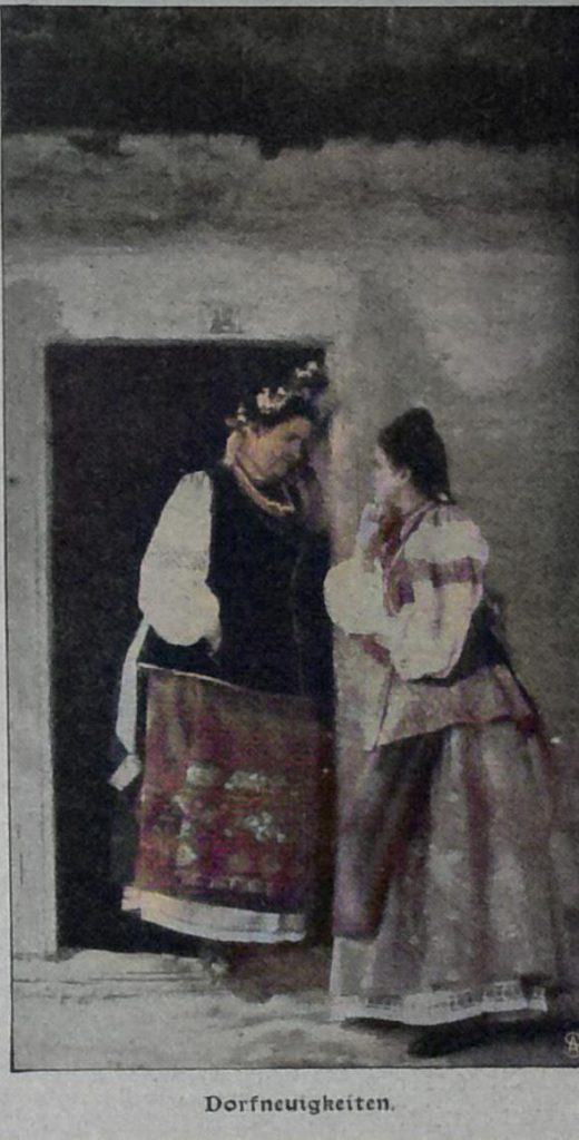 Schon äußerlich mutet das kleinrussische Dorf weit freundlicher an als das Dorf in Großrußland. Die Kleinrussen bauen ihre Häuser nicht in trostlos langer Doppelreihe längs der Straße wie die Großrussen, sondern in malerischer Regellosigkeit, am liebsten an einem Bach oder Bergabhang. Keinem Haus fehlt das Gärtchen mit ein paar Bäumen oder wenigstens Holunderbüschen und einem Blumenbeet, von den Sonnenblume und Mohn dem Wanderer freundlich entgegennicken. Die Wohnung des kleinrussischen Bauern unterscheidet sich sehr zu ihrem Vorteil von der unfreundlichen, verräucherten „Isha“ des Großrussen: die Wände sind hell getüncht, der festgestampfte Lehmestrich sauber gehalten. Die blankgescheuerten Tische, der mächtige Ofen neben der Tür, das hochaufgetürmte Bett, der Glasschrank mit den Tongläsern und Tassen, der blinkende Samowar – alles das verrät den Sinn für Ordnung, für eine gewisse Beaglichkeit. Malerisch bunt ist das Kostüm der Kleinrussen mit den zierlichen Hemdstickereien, dem eigenartigen Kopfputz und dem ärmellosen Ueberrock. Generation um Generation hält streng an der äußeren Gewandung fest, wie es überhaupt mit der Aenderung der Sitten und Meinungen auf dem platten Land recht langsam geht.