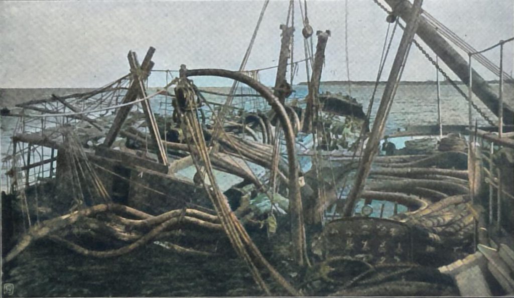 Ihrer Größe entsprechend besitzen diese Zylinder natürlich einen mächtigen Auftrieb, und es leuchtet ein, daß das Schiff sich heben muß, sowie dieser Auftrieb sämtlicher Zylinder größer ist als das Gewicht, das das Wrack im Wasser besitzt. Zugleich war der Taucher hinuntergegangen und hatte alle Undichtigkeiten sorgfältig beseitigt, so daß der kräftige Pumpendampfer durch Entleeren der Innenräume die Hebearbeit des Zylinders unterstützen konnte.